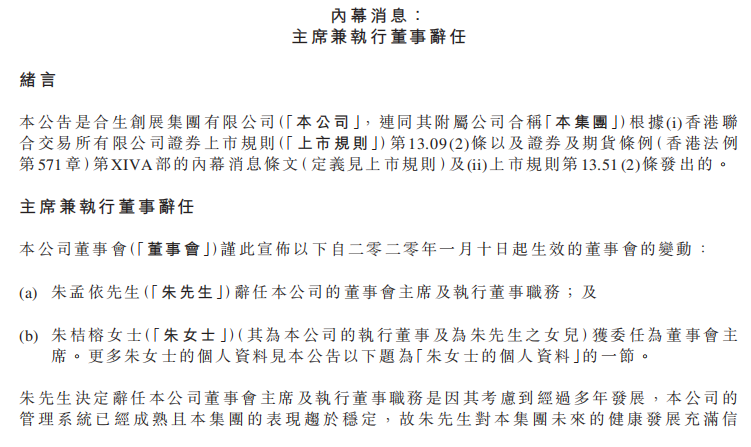 合生创展表示,朱孟依决定辞任公司董事会主席及执行董事职务是因其考虑到经过多年发展,公司的管理系统已经成熟且本集团的表现趋于稳定,故朱孟依对集团未来的健康发展充满信心,并认为现在是其退出董事会的适当时机。
