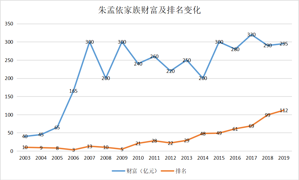 尽管后面十多年,其财富和排名多有波动,但始财富终保持在200至300亿元左右。最新数据显示,2019年,朱孟依家族以295亿元的财富排在胡润百富榜第112名。