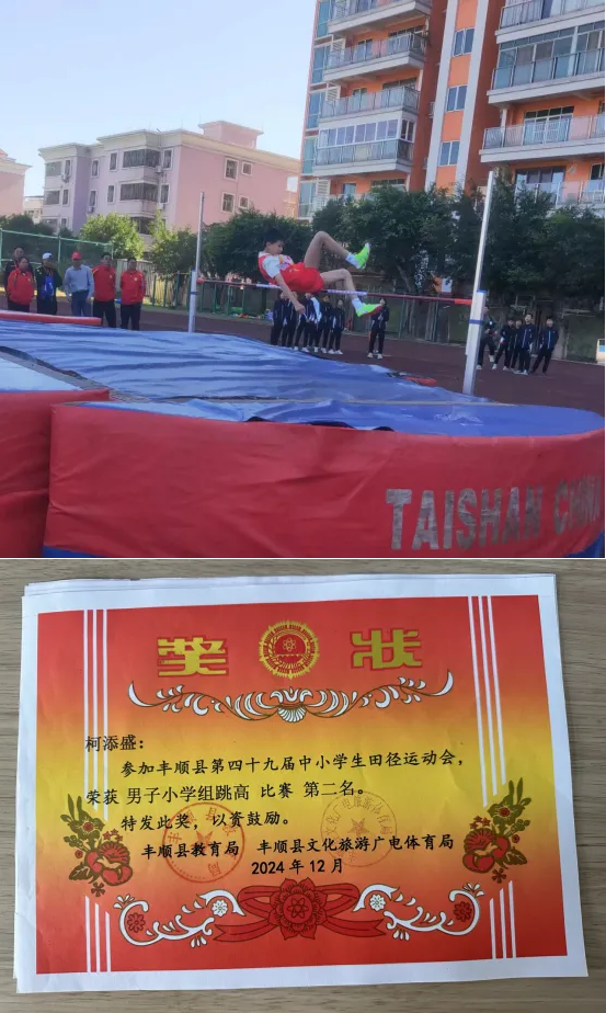 与此同时,在小学男子跳高赛场上,柯添盛同学同样不甘示弱,以优异的成绩荣获全县第二名,用汗水浇灌出属于自己的荣耀之花。