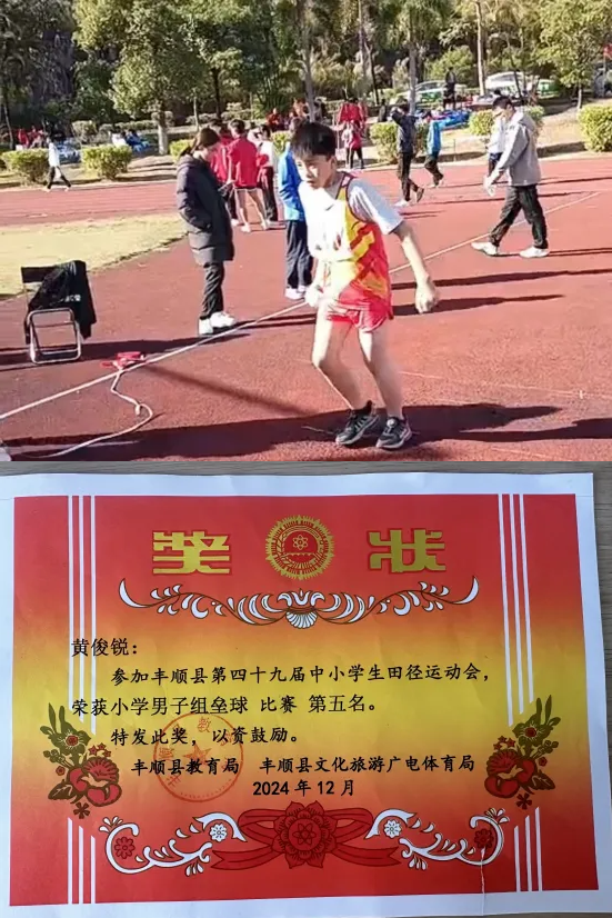 在田径场的另一端,小学男子垒球项目中,黄俊锐同学以稳健的投掷技巧,荣获全县第五名,他的每一次挥臂都凝聚着对胜利的渴望和对梦想的追求。