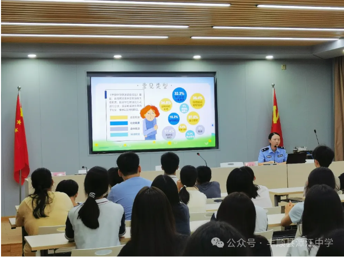 讲座中,王警官以生动案例为引,清晰拆解校园欺凌的“真面目”:从拳脚相加的身体欺凌、恶语相向的言语欺凌,到暗中孤立的间接欺凌、网络传谣的新型欺凌,再到破坏财物、强迫行事等具体表现,让同学们认清欺凌的多样形态。她还深入剖析欺凌者、被欺凌者与旁观者的角色影响,让同学们直观认识到欺凌对身心的双重伤害,以及可能引发的法律后果。