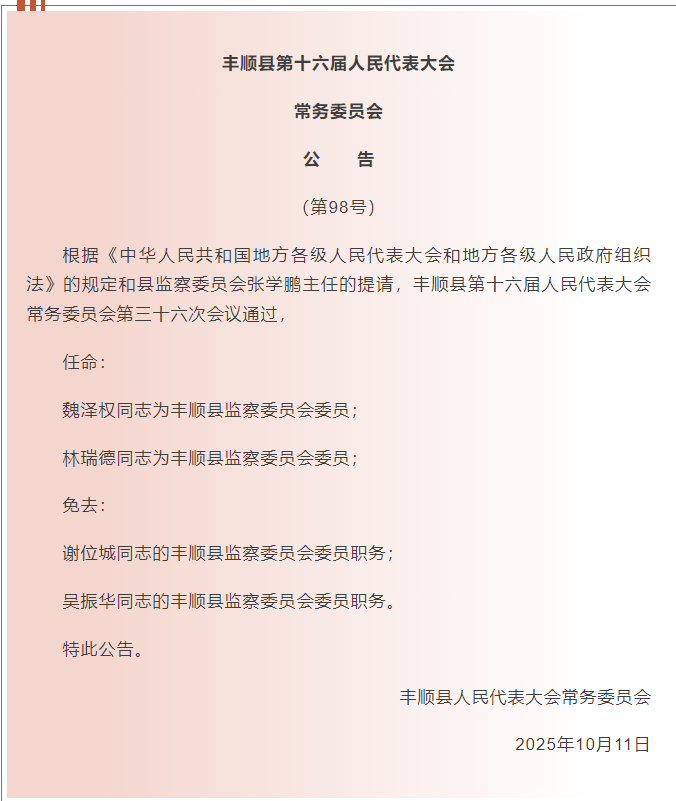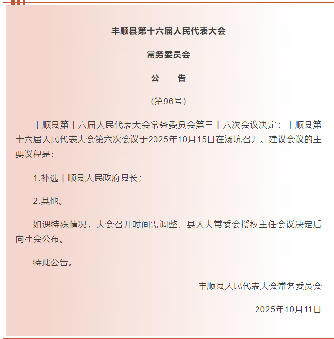 10月11日上午,丰顺县十六届人大常委会召开第三十六次会议,审议决定若干事项。会议决定,丰顺县第十六届人民代表大会第六次会议将于10月15日在县城汤坑召开。