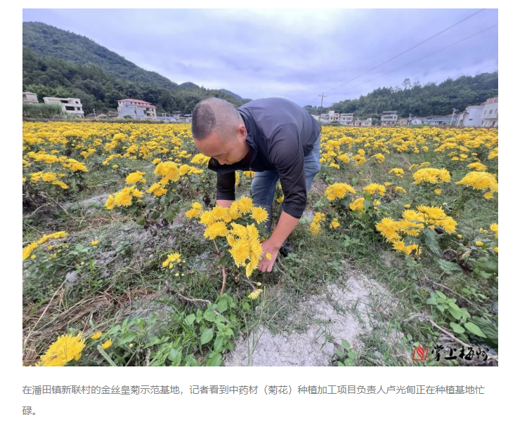 在潘田镇新联村的金丝皇菊示范基地,记者看到中药材(菊花)种植加工项目负责人卢光甸正在种植基地忙碌。