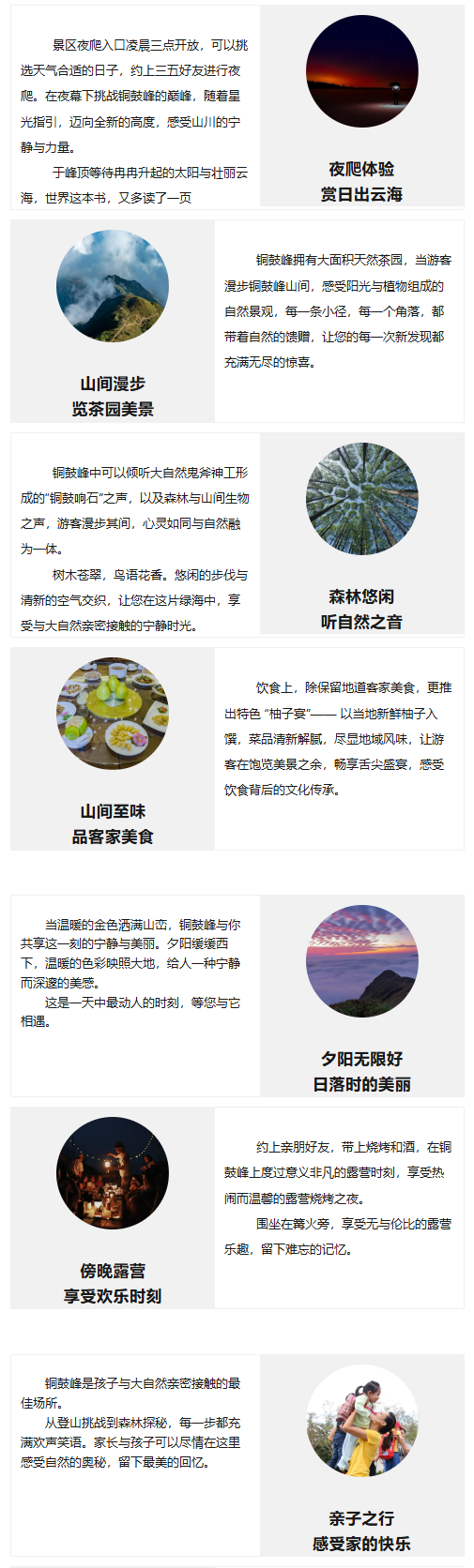 春日里,万物复苏,山花烂漫,嫩绿的植被与绚烂的花朵交织成一幅生机勃勃的画卷;夏日,峰顶云雾缭绕,凉爽宜人,是避暑探幽的绝佳去处,绿意盎然中透着几分清幽与神秘;秋风起时;层林尽染;金黄、火红交织,仿佛大自然的调色盘倾泻而下,美不胜收;及至冬日,银装素裹,白雪覆盖下的铜鼓峰更显庄重与宁静,冰凌挂枝,宛如童话世界,四季更迭,每一季都赋予铜鼓峰独特的魅力与景致 。