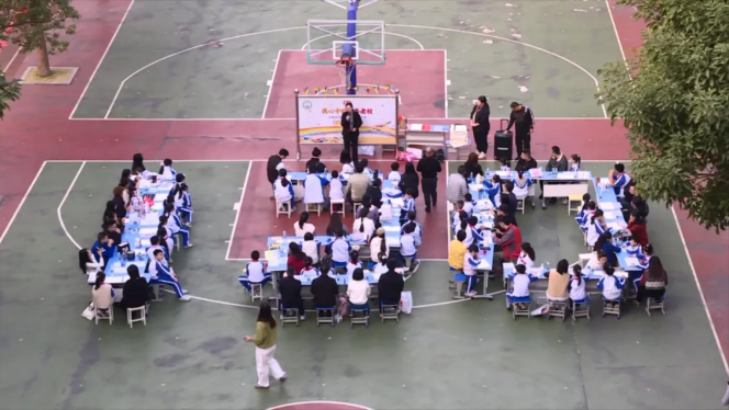 手绘大赛中,一张张书桌被精心拼搭成“一百二十”字样,家长与孩子围坐其旁,紧扣“我心中的百年老校”主题携手创作。