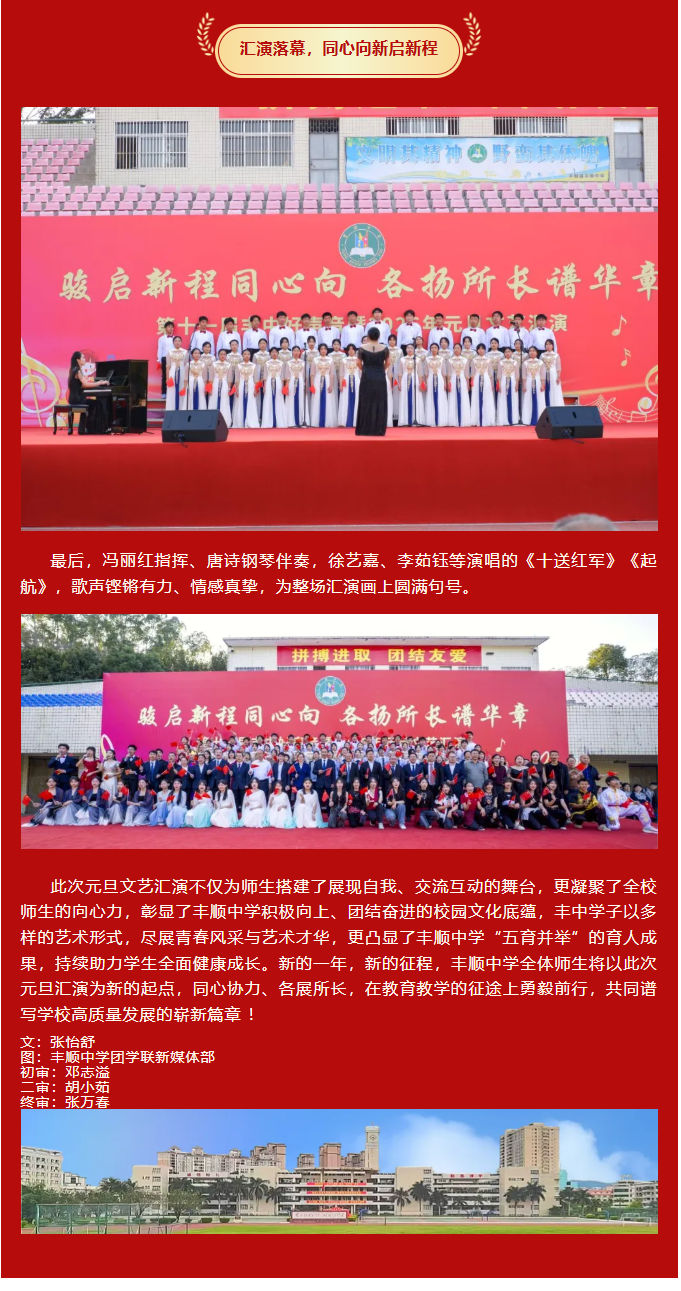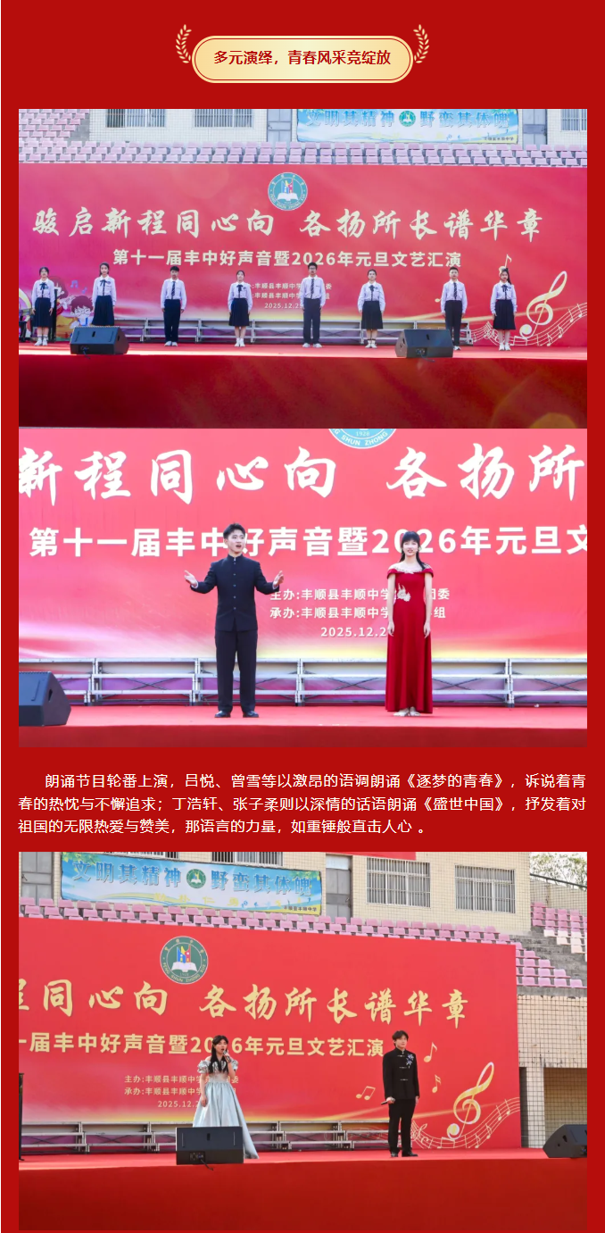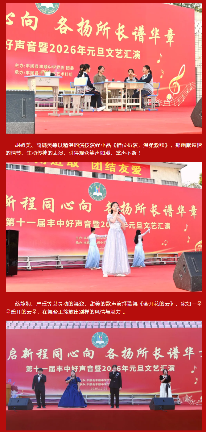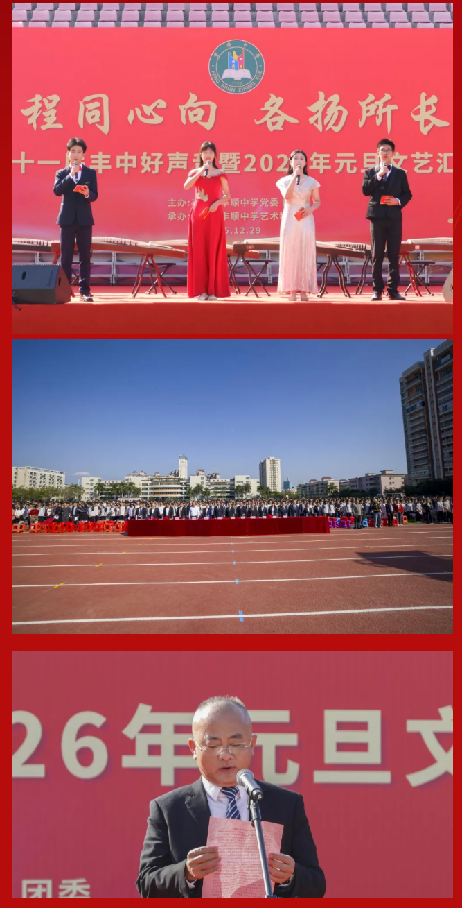律回春晖渐,万象焕新颜。值此2026年元旦即将到来之际,为凝聚师生同心之力,展现丰中学子昂扬之姿,丰顺中学“骏启新程同心向,各扬所长谱华章——第十一届丰中好声音暨2026年元旦文艺汇演”于学校运动场隆重举行。 丰顺中学党委书记徐文丰、校长张万春携学校班子成员、行政人员等,与全校师生齐聚运动场。蔡贤印、罗宝兒、陈瑞曦、张子柔四位主持人联袂登场,在异彩纷呈的节目中辞旧迎新,共赴这场青春洋溢的文艺盛宴 。