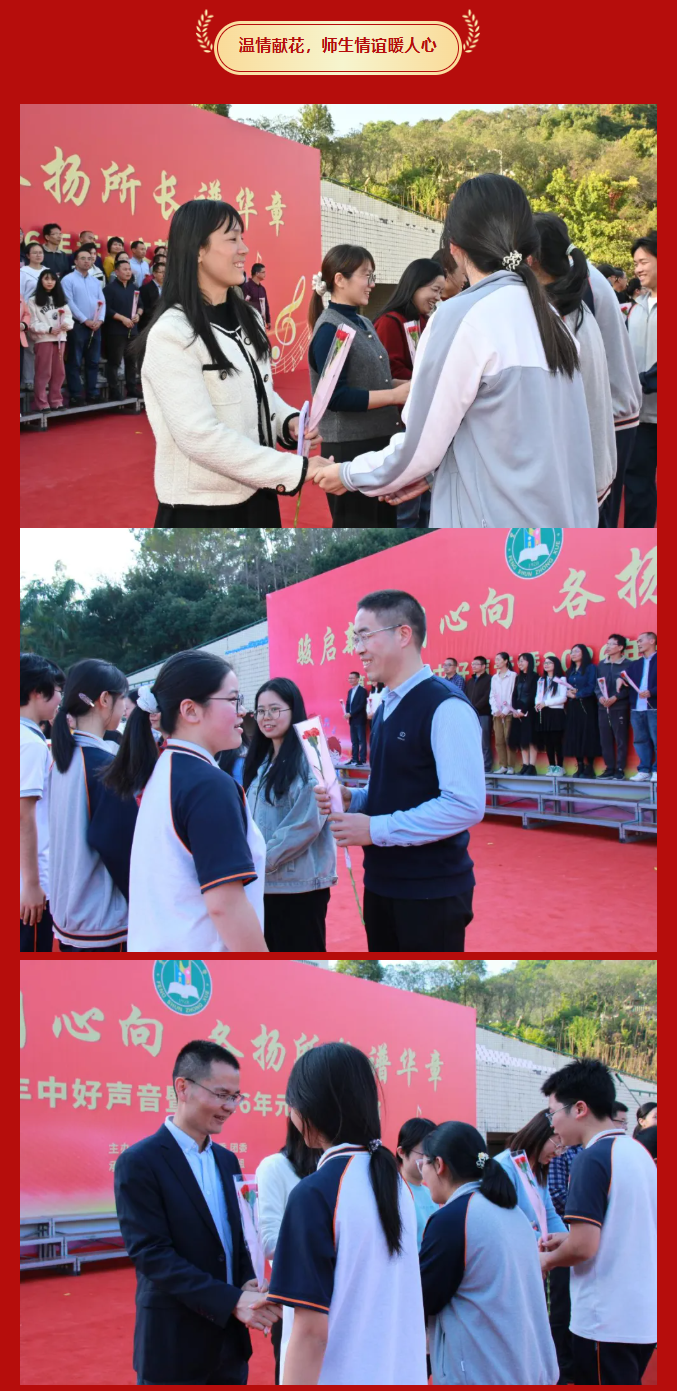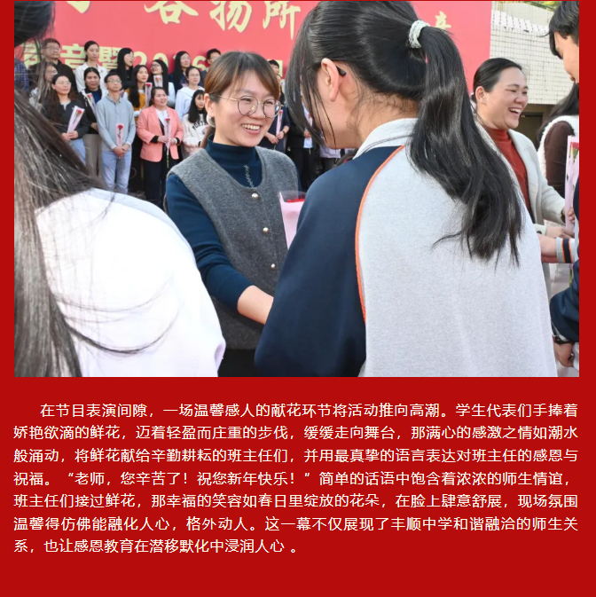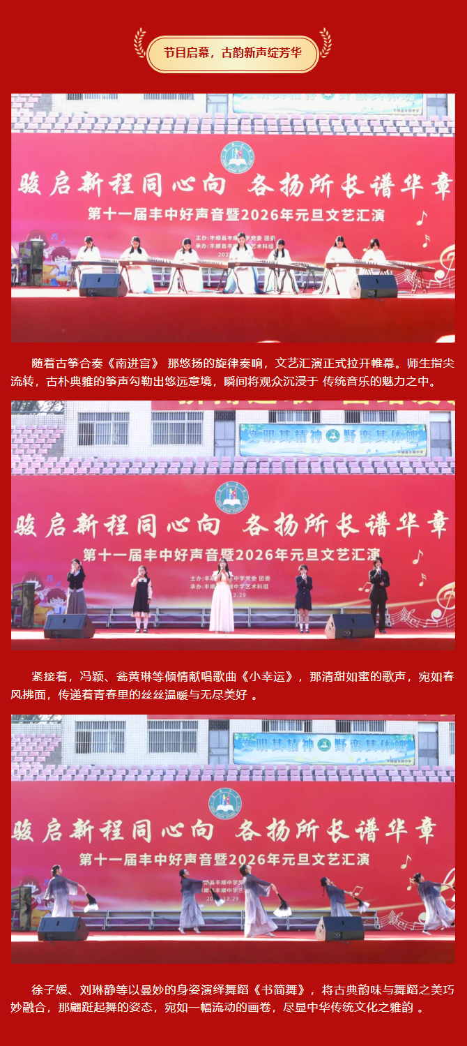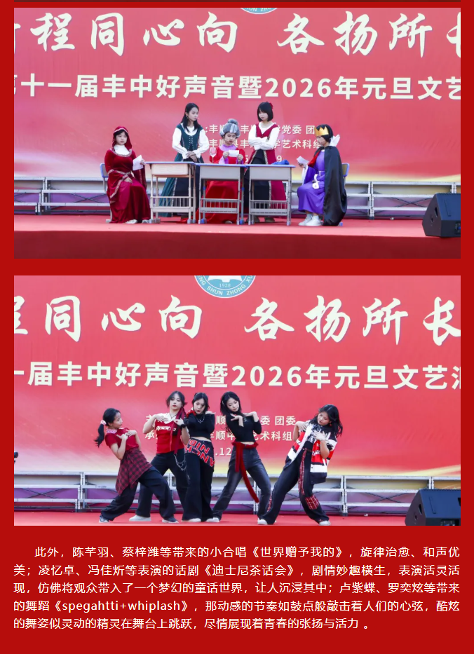 律回春晖渐,万象焕新颜。值此2026年元旦即将到来之际,为凝聚师生同心之力,展现丰中学子昂扬之姿,丰顺中学“骏启新程同心向,各扬所长谱华章——第十一届丰中好声音暨2026年元旦文艺汇演”于学校运动场隆重举行。 丰顺中学党委书记徐文丰、校长张万春携学校班子成员、行政人员等,与全校师生齐聚运动场。蔡贤印、罗宝兒、陈瑞曦、张子柔四位主持人联袂登场,在异彩纷呈的节目中辞旧迎新,共赴这场青春洋溢的文艺盛宴 。