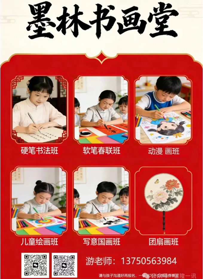 墨林书画堂寒假10天连续集训(1.31-2.9),让手感和心性同步!写意国画、软笔春联、团扇画、硬笔书法 +少儿创意绘画、动漫画全覆盖,扫码加微信或电话咨询:13750563984或者18300010725,专业指导 + 趣味教学,让孩子在笔墨间遇见更好的自己。