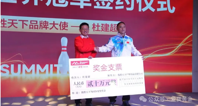 签约仪式现场,揽胜天下向中国保龄球领军人物杜建超颁发20万元“为国争光”奖励。这不仅是对他取得中国保龄球历史性突破的嘉奖,更是揽胜天下品牌以实际行动推动保龄球运动在中国普及、助力中国保龄球进一步迈向世界顶峰的坚定承诺。