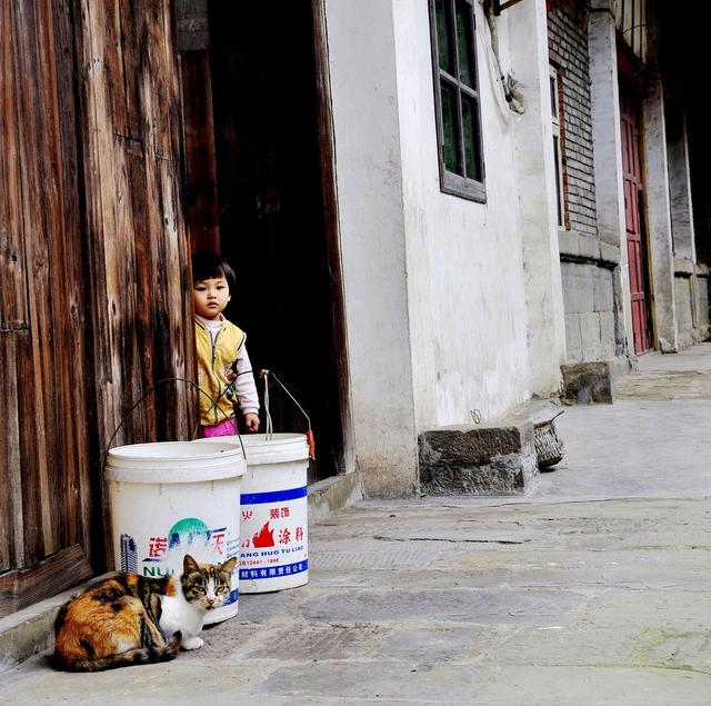 不知不觉又转回到了路口,见到一可爱的小姑娘在家门口和猫玩,这可是古寨里我见到的唯一的山寨小公主了。 小花猫动态十足,小姑娘乖巧可爱,这可是难得的好景象,我端起相机打算拍两张,那小丫头转身就跑进屋里躲起来,很快又伸出身子瞧着我,紧跟着屋里的爷爷奶奶不知有什么情况发生也出来了,见我在跟小姑娘打招呼,老两口笑了笑便进去了。不一会儿,小姑娘恢复了常态不再害怕和害羞,开始大大方方地站在门边让我拍。就这样心满意足地留下了小姑娘和小花猫可爱的身影。拍完了,我一边逗着小丫头玩,一边在想,在山寨里忽悠了大半天,也没见到一两个年轻人,只有老人在这里墨守成规,照顾着孙儿孙女。这两三岁的小女孩,再过几年或十来年,也必定是要下到山外去的,必须的,没有什么东西能留得住她,也不应当挽留她,她虽生长在这里,但她无疑是不属于这座荒凉而寂静的山寨的。