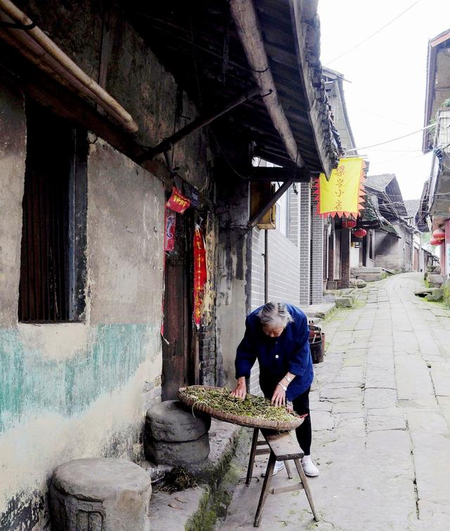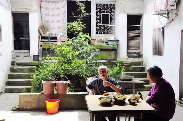 接近中午时分,我欣喜的发现一家四合院门洞大开,天井里老俩口正在吃午饭。我跨进去向老人打招呼,令我很惊讶的是小桌上摆放了三大钵菜,红烧鱼块、芹菜炒肉丝、竹笋烧鸡,荤素皆有,香味弥漫,十分家常,与别的镇上人家就一两个小菜不同,显得有些隆重,似乎是为大爷或婆婆做生一般。大爷笑眯眯地端起酒杯招呼我:“坐下来喝一杯嘛。”我口里说不了,谢谢。可这一桌丰盛的家常美肴,确实勾引得我馋虫乱翻,口水倒灌。我不停地赞扬菜做的很好,大爷不无骄傲的说:“那是的,我家老婆子手艺不错哦!比街上馆子头做的还好吃。”婆婆随即呵呵笑起来。那一刻,一股股浓浓的久违了的温馨与温情让我心里特别的舒坦和感动。