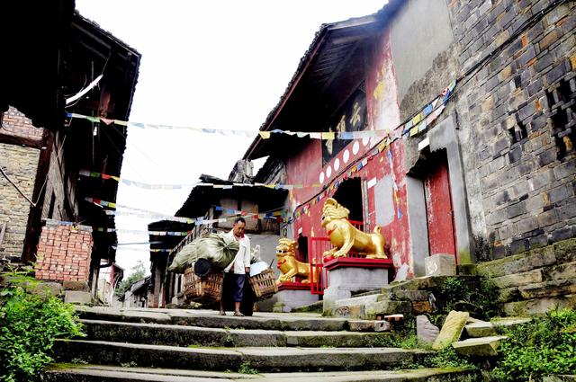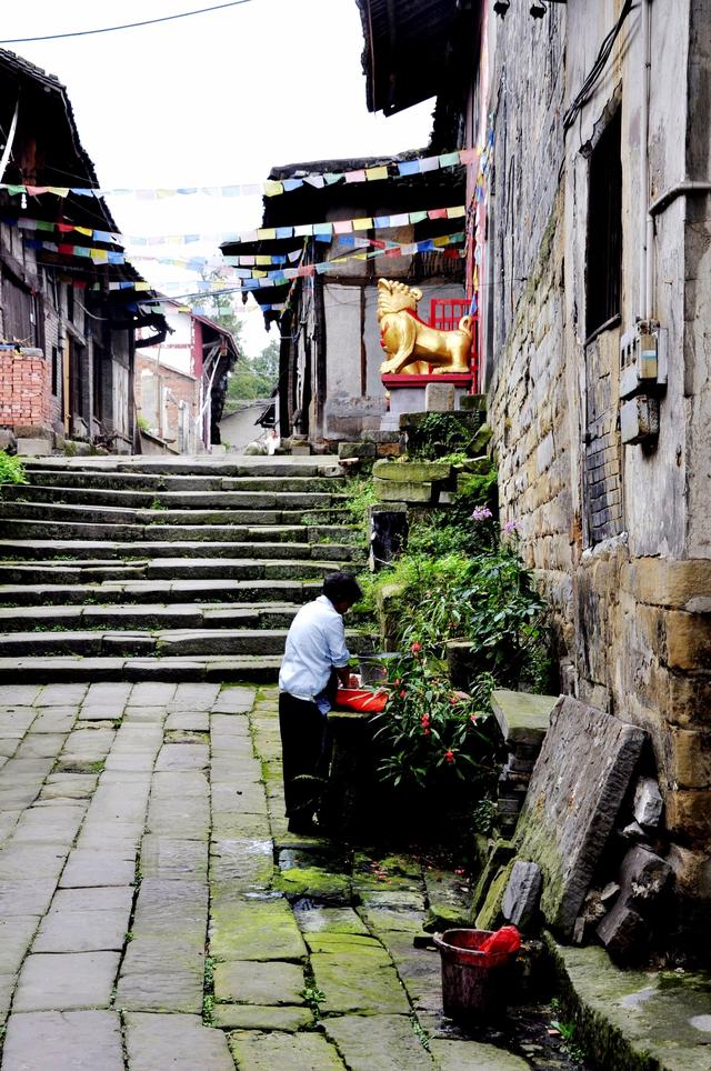 回到现实中,云顶场的寂寞让你似乎又感觉到,她连同云顶寨一样是座被遗弃了的空场,甚而连鸡鸣犬吠声都很难听见。两旁的木楼安详的静立,虽不是古色古香,但雕花雕龙的门窗和屋檐总能透析出一股年久的古旧味道。沿街的店面很多,但不知道是时间过早,还是游客不多的的原因,取下木板条开门迎客的不多。已经开着的,多为茶馆或面馆和药店。在四川,茶馆是乡镇上一道永不褪色的风景,这里亦然。你看那些长板凳或老竹椅、八仙桌或小方凳、大嘴壶及盖碗茶,似乎正传唱着石街一段段的历史,一页页的传说。路过一家简陋的家庭面馆,主人却问我要不要一碗醪糟粉子荷包蛋,我才想起这里的祖先都是来自湖北麻城,记忆中麻城最好吃的东西,不就是一碗红糖醪糟荷包蛋吗?