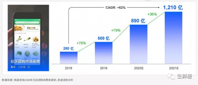 美团优选加速狂奔,也说明如今社区团购赛道竞争激烈。凯度咨询2020社区团购白皮书表明,到2020年社区团购市场规模预估达到890亿。而到2021年社区团购市场规模更是高达1210亿,较2018年社区团购发展初期翻了4倍。