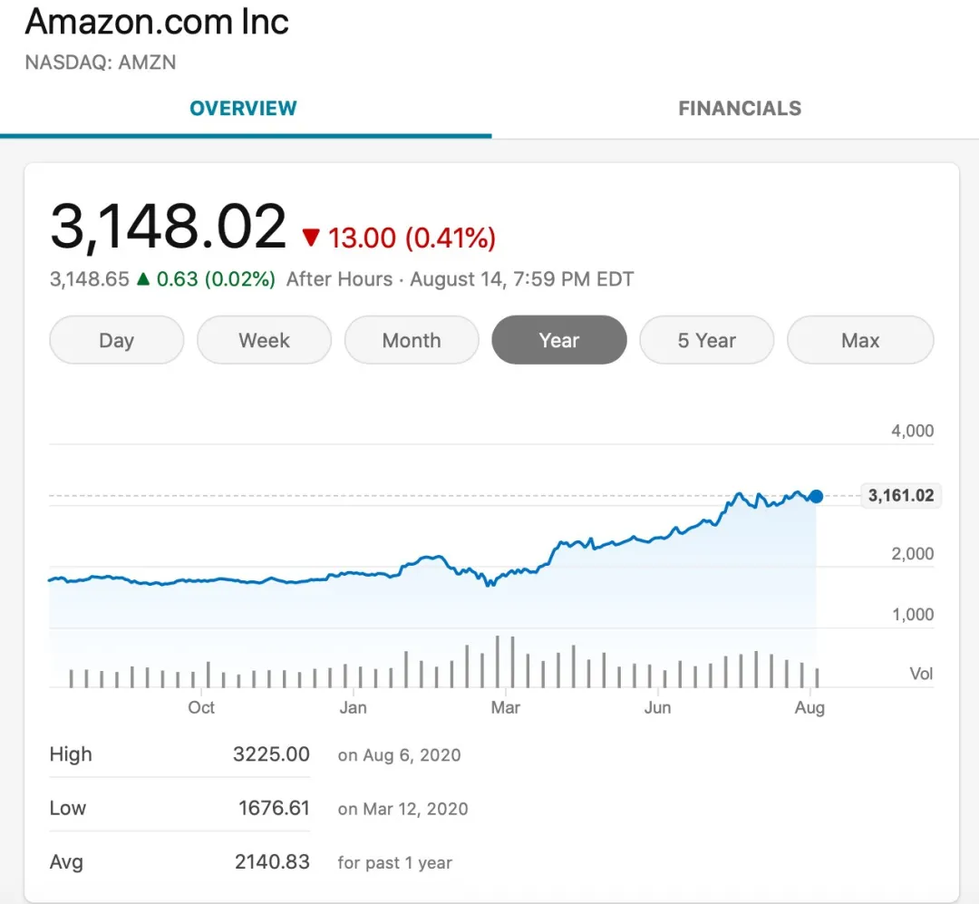 亚马逊年内股价低点是1676.61刀,出现在3月中,那时美国疫情病例数量开始上升。高点在8月,达到3225.00刀,一股要2万多人民币。半年不到,高低点对比大约涨了92%。看着股价涨得那么好,首富姐夫最近也套现了一部分,支持自己的火箭公司。