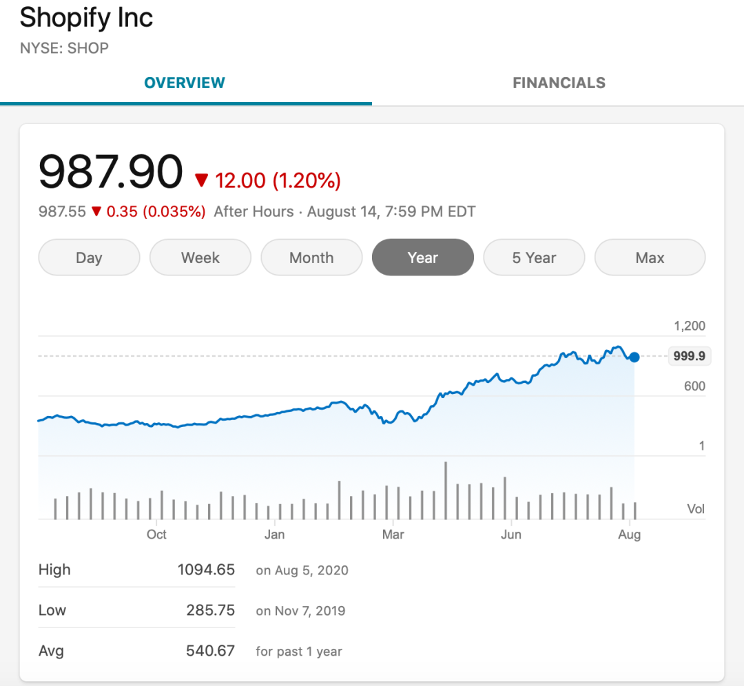 为独立站提供建站平台的Shopify,被认为是未来最有可能挑战亚马逊的电商平台。Shopify过去一年股价低点出现在去年11月,是285.75刀,后来逐步上升,由于疫情影响今年3月也一度跌到接近300刀。但4月6日开始,几乎是和亚马逊FBA限制发货的日期相匹配,Shopify股价就一路上升,8月初到达1094.65刀刀股价高点,高低点涨幅达到283%。