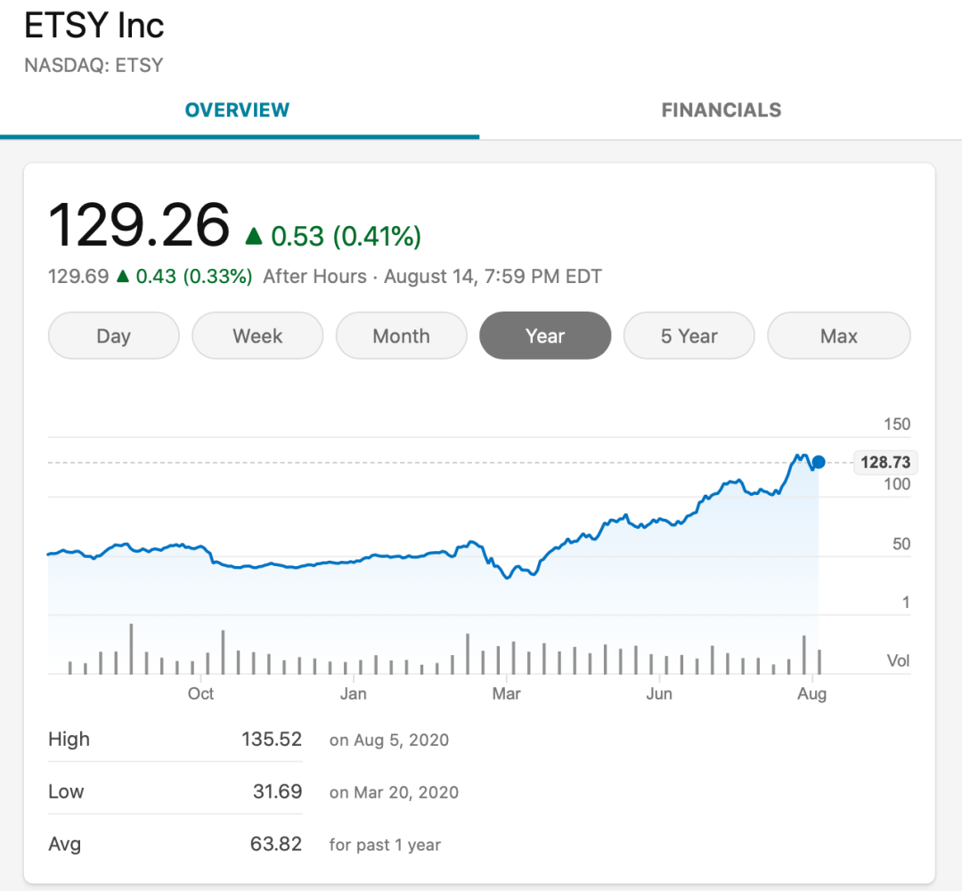 Esty是主打北美市场的手工艺品电商平台,过去一年股价低点同样出现在3月,是31.69刀,高点在8月,升到135.52刀,这半年高低点对比涨了328%。投资Esty可比在Esty上卖货赚钱效率高啊!