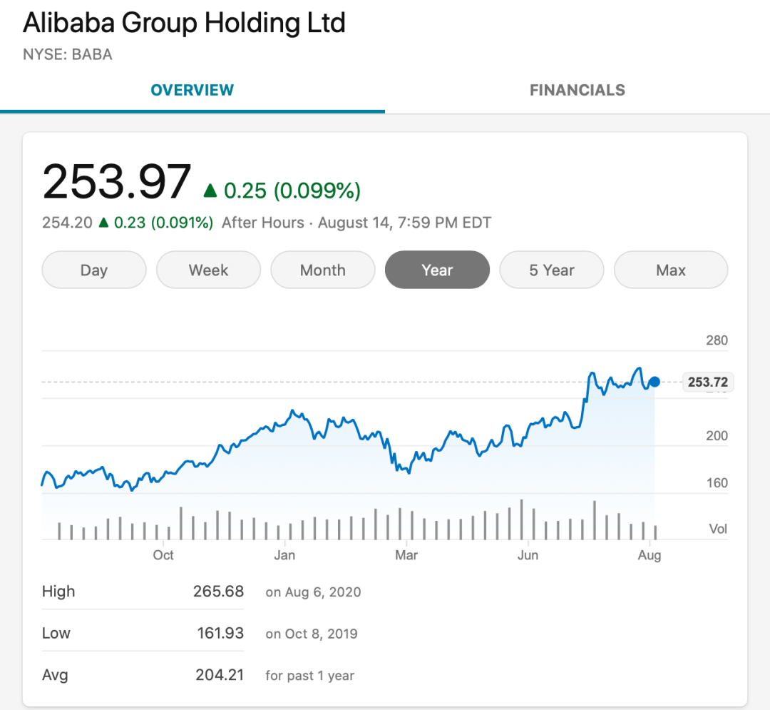 过去一年之内,阿里巴巴股价的最低点是161.93刀,最高点是近期的265.68刀,高低点对比大约涨了64%。