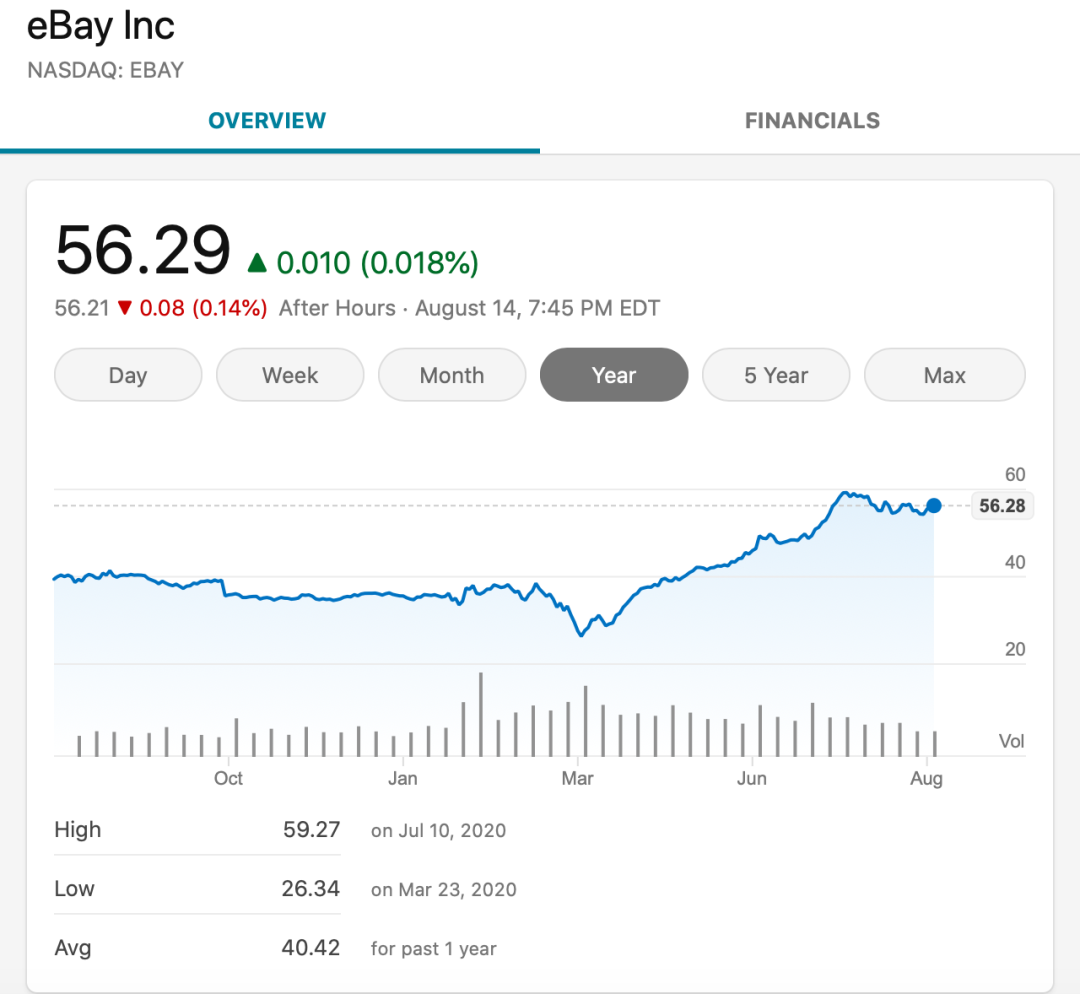 eBay的走势和亚马逊接近。在3月走到低点26.34刀,随后开始逐步攀升,7月份到达高点59.27刀。4个月不到,高低点对比已经翻番,大约涨了125%。