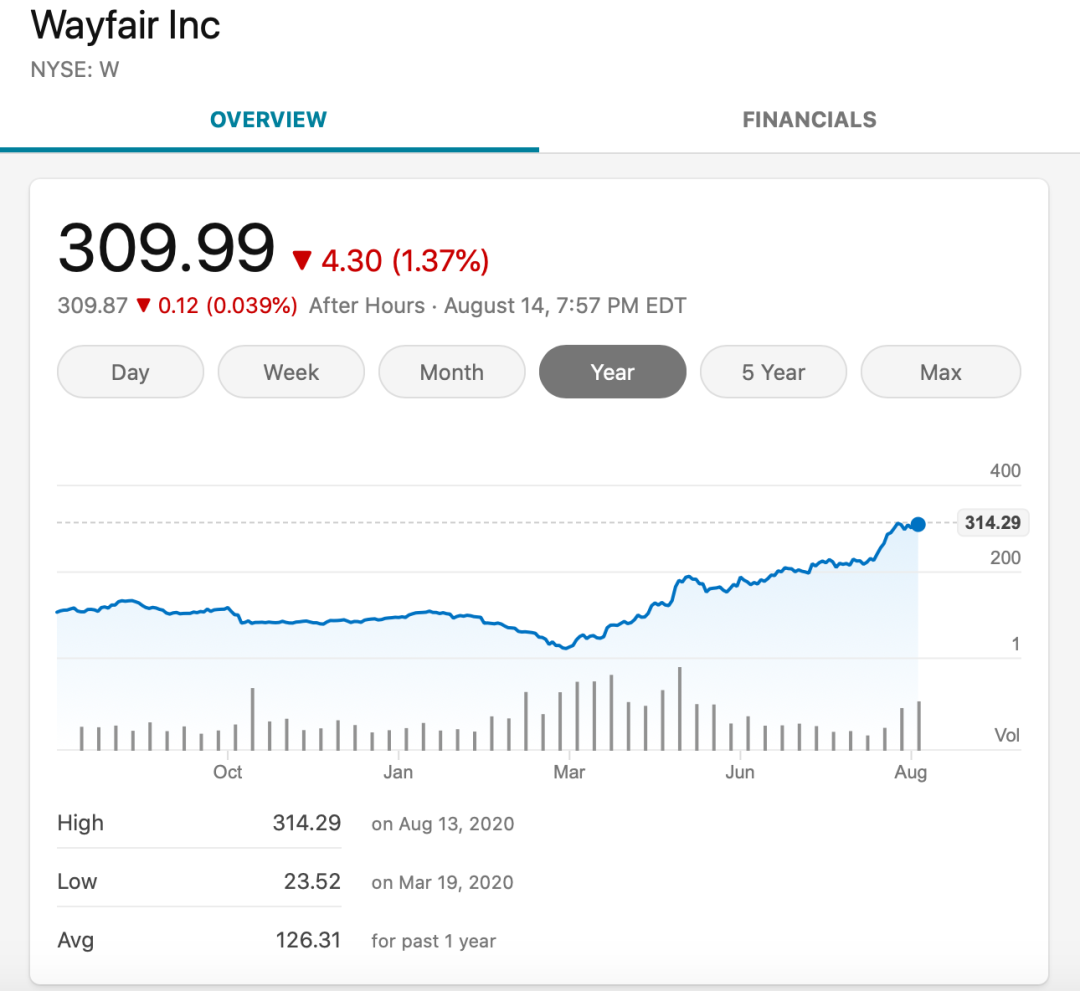 Wayfair是美国知名的家居电商平台。过去的文章里,我和大家说过很多回,今年家居类产品在跨境电商市场非常爆。而作为平台,Wayfair享受了投资者极高的溢价!和Esty的股价走势非常类似,Wayfair在3月下旬美国疫情快速增长时股价到达年内低点,是23.52刀。随后,由于友商亚马逊FBA仓库各种限制,配送能力大幅受限,Wayfair趁机攻城略地,股价也是一路高歌猛进,8月到达高点314.29刀。5个月内可是涨了12倍多啊!