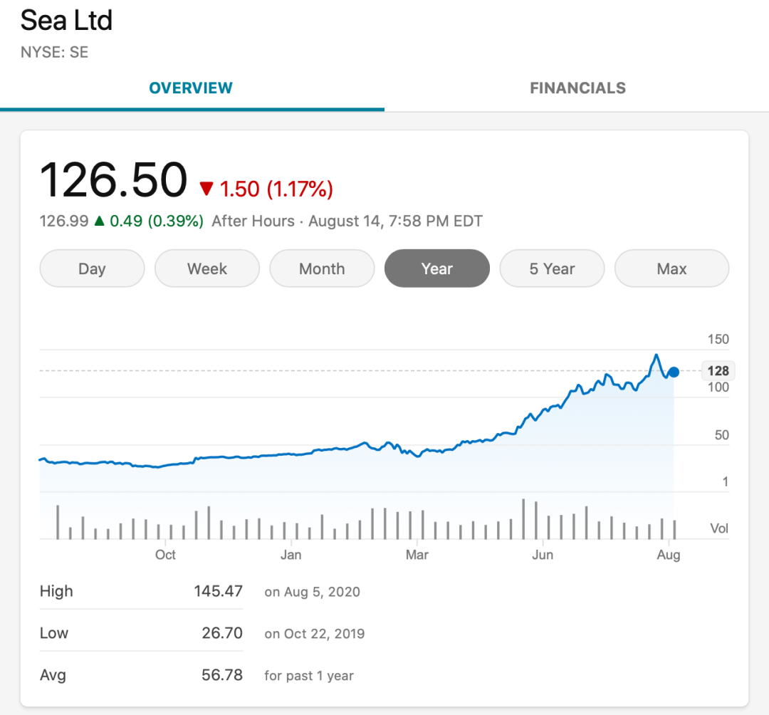 东南亚领先的电商平台Shopee母公司SEA Group,从去年就开始了直升机模式。股价一年内从去年10月的低点26.70刀,涨到今年8月的129.00刀,疫情期间也没怎么跌,涨幅高达383%!这也说明,东南亚的电商市场,还处于增长期。