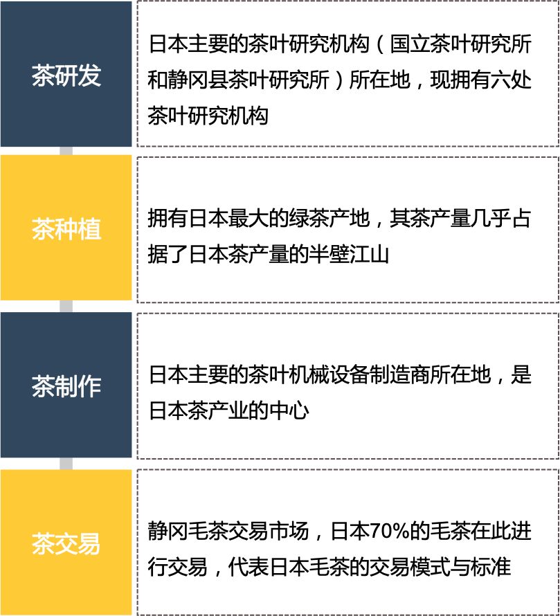 静冈拥有了日本最大的绿茶产地,其茶产量几乎占据了日本茶产量的半壁江山。在这基础上静冈积极构建传统茶叶产业体系,在种植、研发、制作、交易方面取得了巨大的成就与创新。