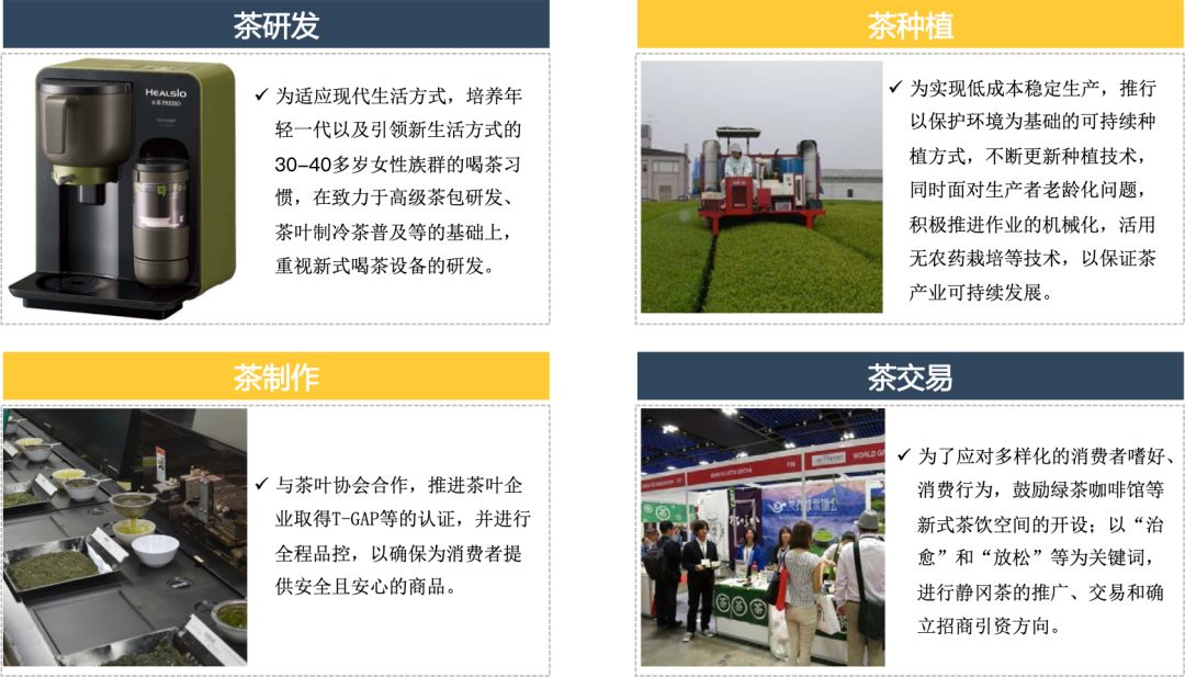 对相关历史遗迹和文献资源进行保护和传播;专业机构联合举办研讨会、茶文化讲座等;制作通俗易懂的茶文化、茶产业宣传册并广泛发放;广泛推广日本茶道,为学生、游客等创造体验日本茶道的机会。