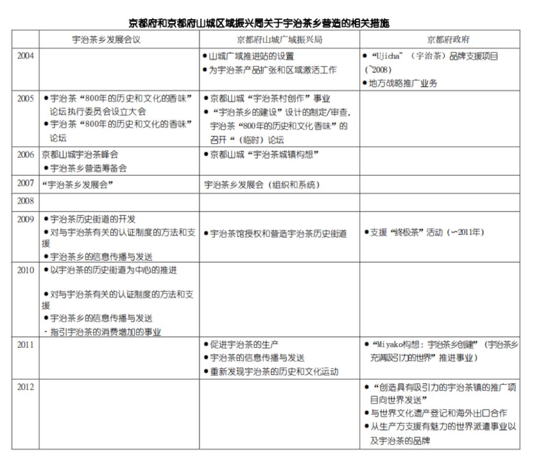 从2003年度到2012年度的京都府和京都府山城广域振兴局的宇治茶乡营造的相关措施来看,该策略有2个轴心:一是作为宇治茶品牌支援策略,二是作为山城的乡村振兴策略。