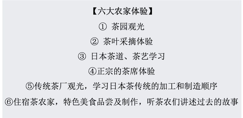 静冈县地处东京和大阪中间,是日本三大主要产茶区之一。当地至今保留着古老的“茶草场农法”种植手法。为了表彰其在保护受全球环境恶化、人口增长的影响而日渐衰退的传统农业、文化、生物多样性和土地景观等方面做出的贡献,联合国粮农组织(FAO)将静冈“茶草场农法”认证为全球重要农业文化遗产(GIAHS)。目前,静冈已经成为日本茶文化旅游的圣地,各类古老的茶文化元素都被运用到旅游开发中,再次焕发出蓬勃的生机,促进了经济繁荣。