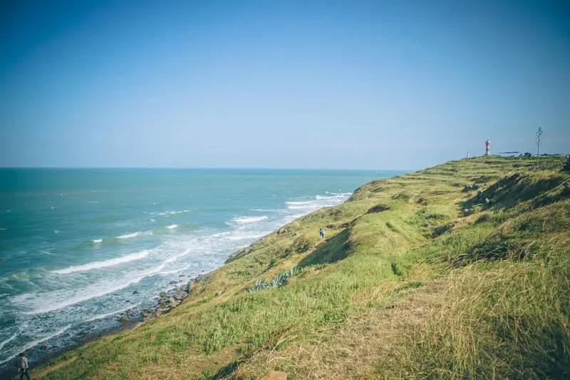 站在镇海角的草坪上,眼前是蔚蓝的天空和环绕的海景,脚下是碧绿的草地和盛开的野花,远处还有两座红白相间的灯塔。