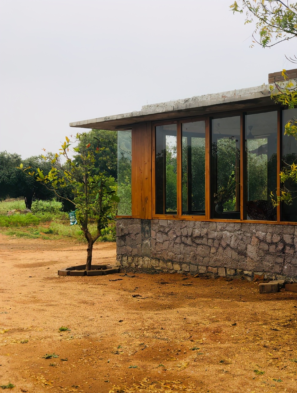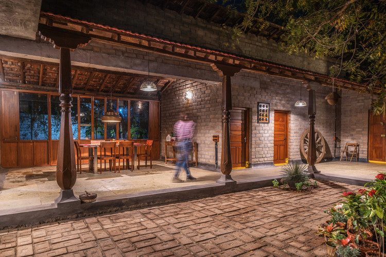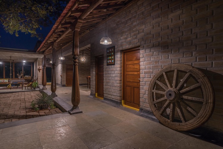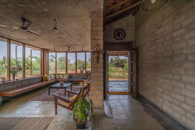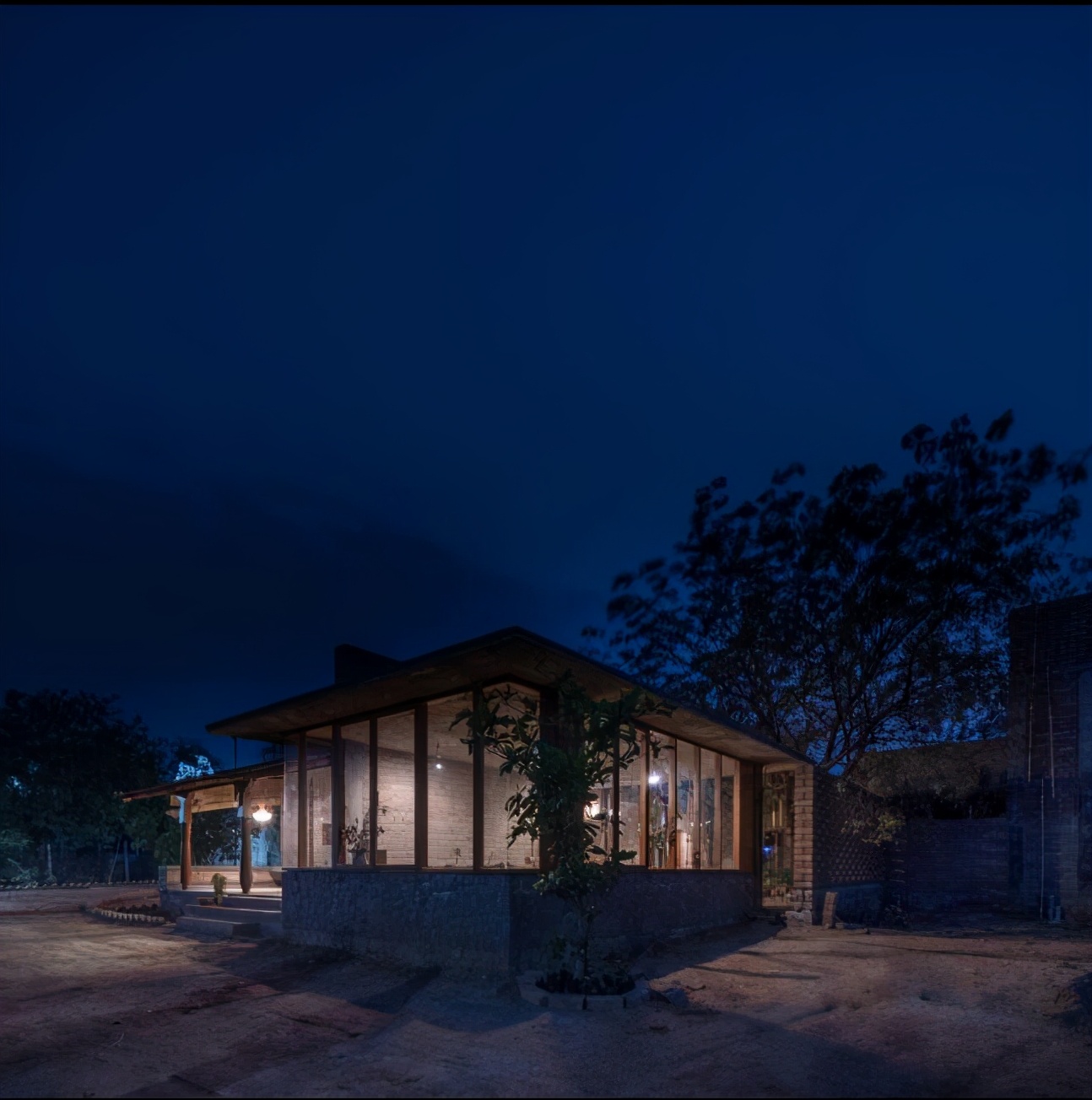 农舍被编织成一棵现存的树木,并从所有空间围绕一个视觉连接的庭院进行设计,而不会失去空间的线性度。沿法院引入一条中央连接的线性走廊,使客户对同时拥有线性房屋和四合院房屋感到满意。由农田黏土制成的压缩稳定土块,符合人体工程学的门槛水平,多功能和非刚性家具布局,人性化的可扩展性,实质性是使项目可持续发展并改善用户体验的因素。