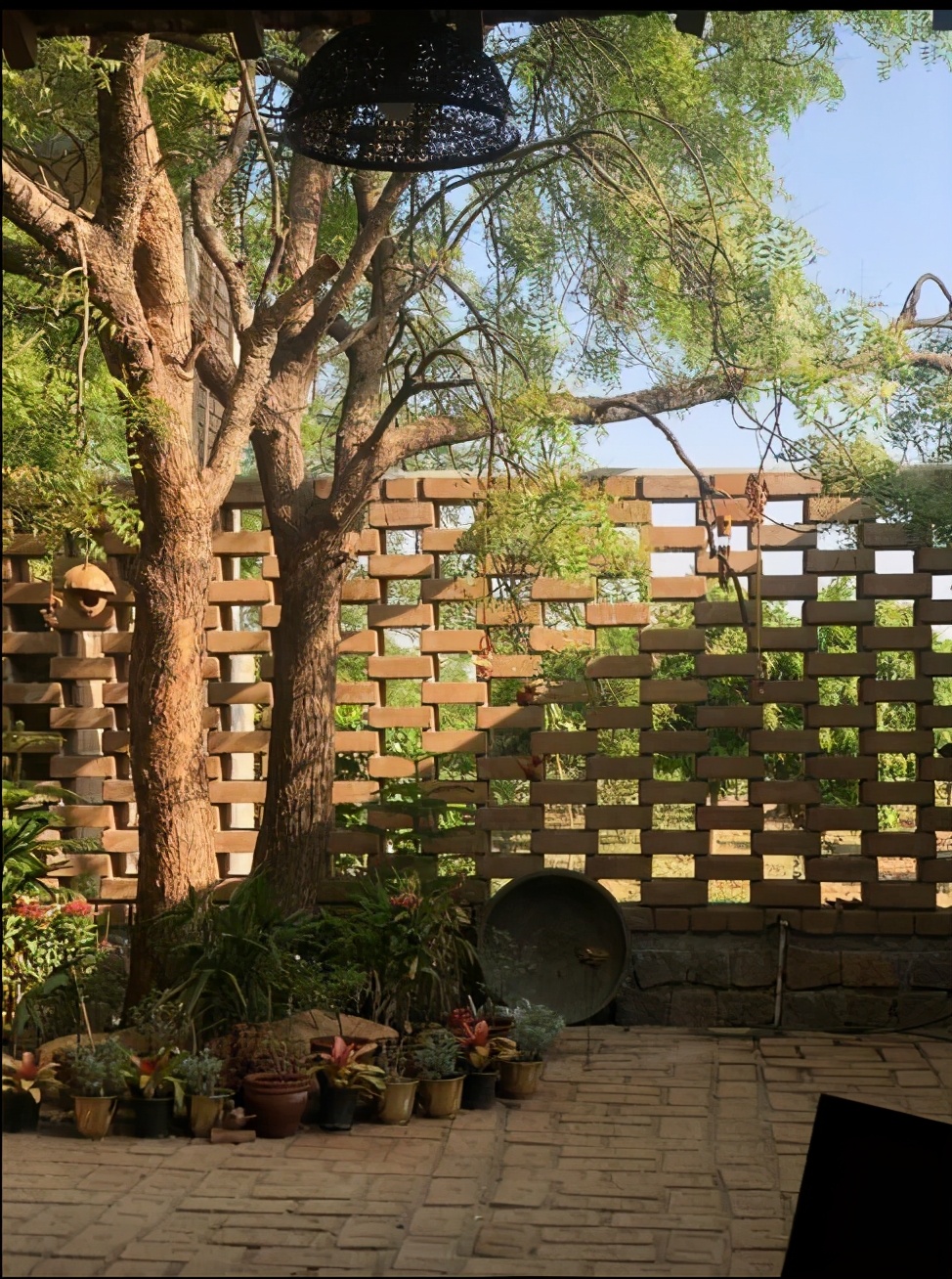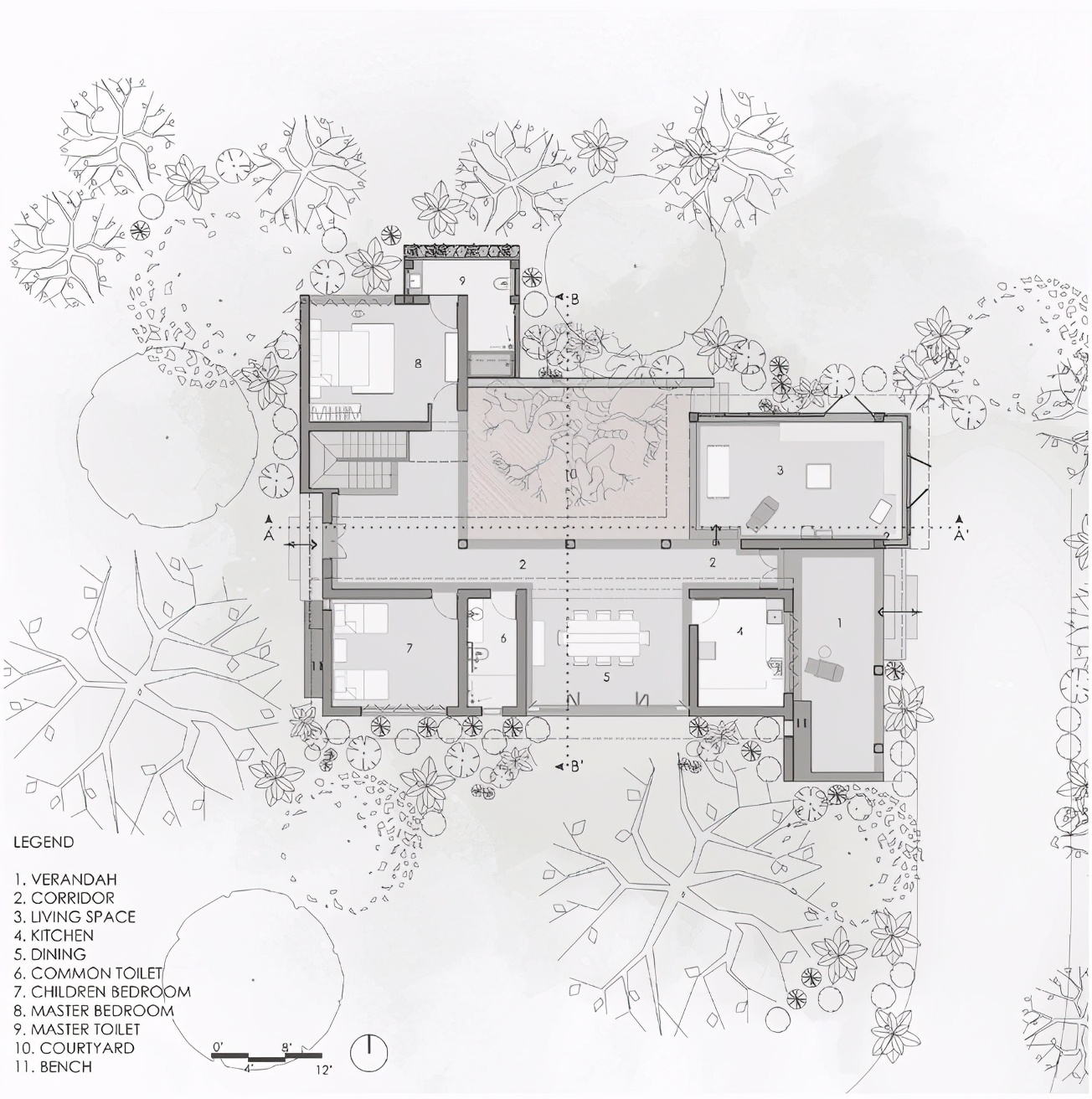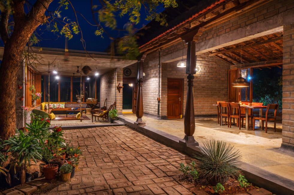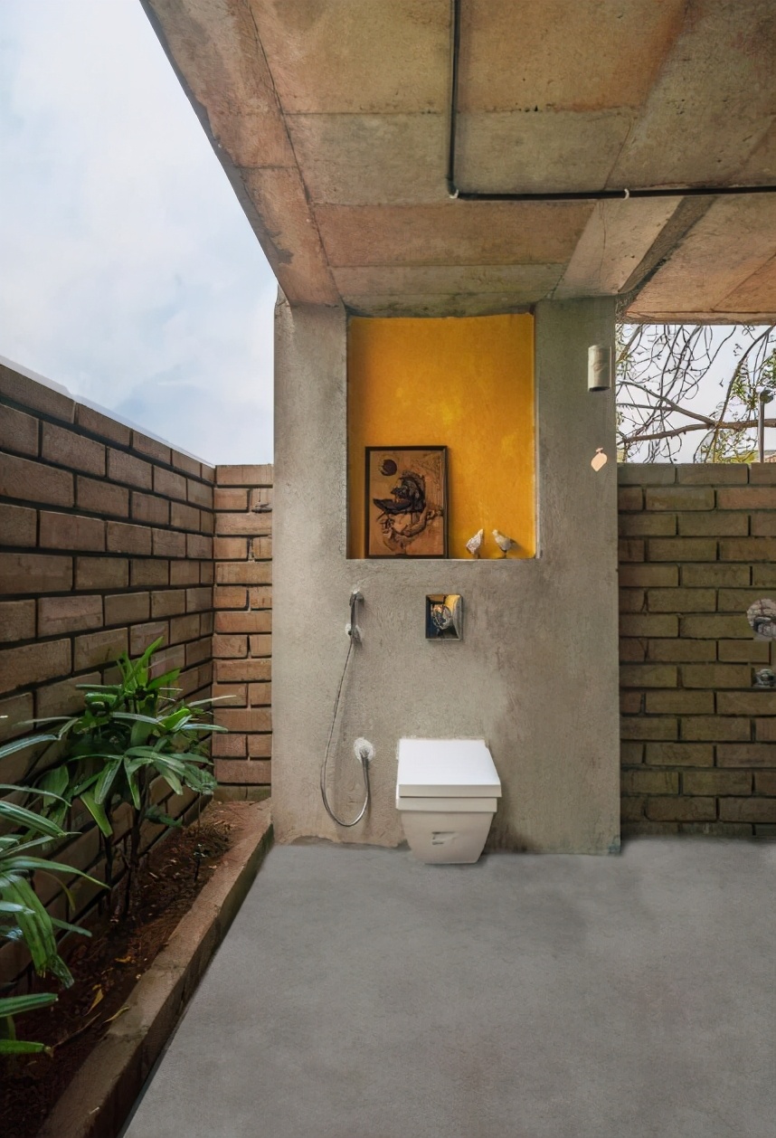 农舍被编织成一棵现存的树木,并从所有空间围绕一个视觉连接的庭院进行设计,而不会失去空间的线性度。沿法院引入一条中央连接的线性走廊,使客户对同时拥有线性房屋和四合院房屋感到满意。由农田黏土制成的压缩稳定土块,符合人体工程学的门槛水平,多功能和非刚性家具布局,人性化的可扩展性,实质性是使项目可持续发展并改善用户体验的因素。