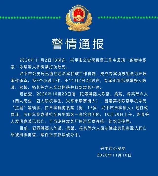 通报显示,经侦查,2020年10月29日晚,犯罪嫌疑人陈某、梁某、杨某等六人(两人无业、四人职校学生,兴平市阜寨镇人),因袁某将陈某手机号码“拉黑”等琐事,在阜寨镇将袁某(男,15岁,兴平市阜寨镇人)殴打致昏迷,后用车将袁某拉至兴平城区一宾馆房间内。10月30日上午,陈某等人发现袁某已死亡,于当晩将袁某尸体运至阜寨镇一处农田掩埋。