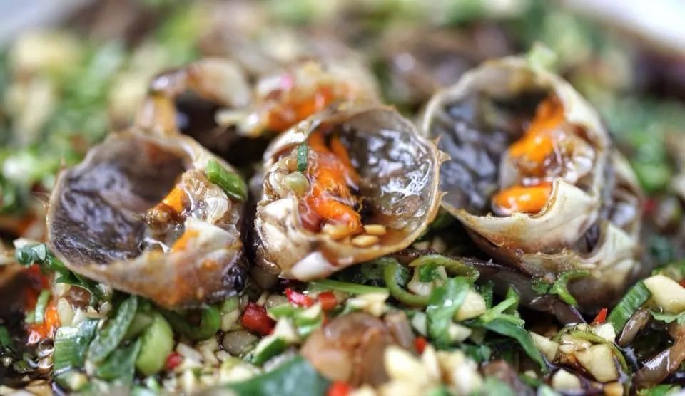 潮人嗜蟹,膏蟹、河蟹、青蟹、梭子蟹皆成佳肴。除了清蒸,镇醋蟹粉、生炒芙蓉蟹、金钱蟹、金鲤蟹膀、干焗蟹塔、清蒸膏蟹、清石榴蟹、炽鸳鸯膏蟹等,都是著名潮菜。不过,最“潮”的吃法,还是生腌。
