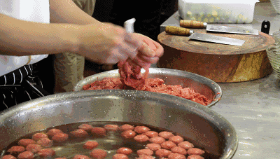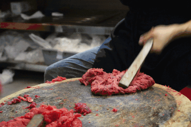 再者,牛肉丸对牛肉的新鲜度要求很高。潮汕宰牛的方式是传统的活牛切腹,这也保证了肉在解剖过程中都是鲜活的。从屠宰到制作牛肉丸,整个过程不超过6小时。制作丸子的牛肉要带着温度,微微能看得到肌肉的跳动,手指轻碰一下,能感觉到肉表面的微微粘性。