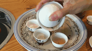斟茶时,三个茶杯放在一起,不能斟满了这杯再斟那杯,而要轮流不停地来回斟,以免出现前浓后淡的情况。饮时先喝一小口,慢慢品,一边品着茶一边谈天说地,这叫工夫。