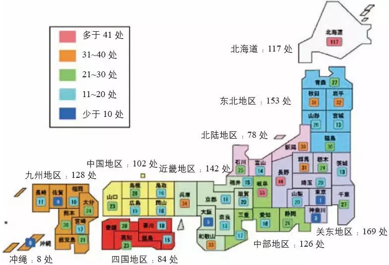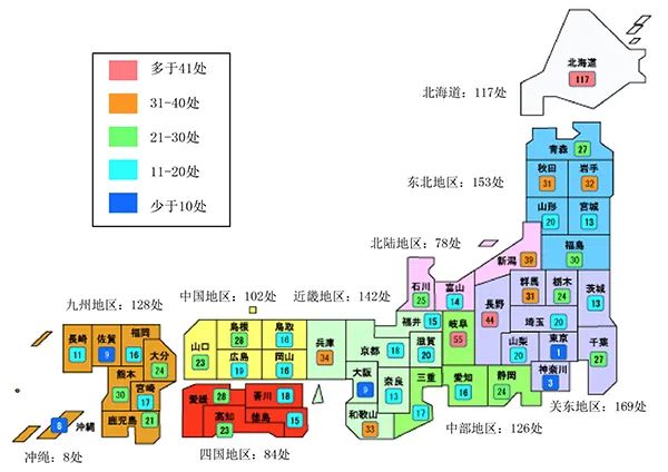 数量少的是冲绳县(8处),九州地区的佐贺县(9处),长崎县(11处),关东地区的茨城县(13处),东北地区的宫城县(13处)和近畿地区的奈良县(13处)。