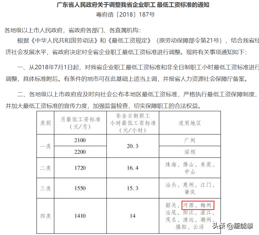 河源、梅州的最低工资标准为1410元每月,这是2018年7月以来至今有效的标准,河源、梅州处于广东最低一档。