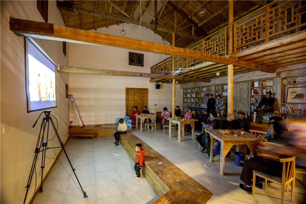 在这座青砖灰瓦的二层建筑里,原有的下沉式鱼露池被改造成阶梯教室的讲台,讲台后的墙上挂着一块投影幕布,对面则是木质桌椅、阶梯和一排书架。阳光透过新开的天窗洒进屋内,通高空间的设计让那些在楼上品茶的村民也能尽情观影。
