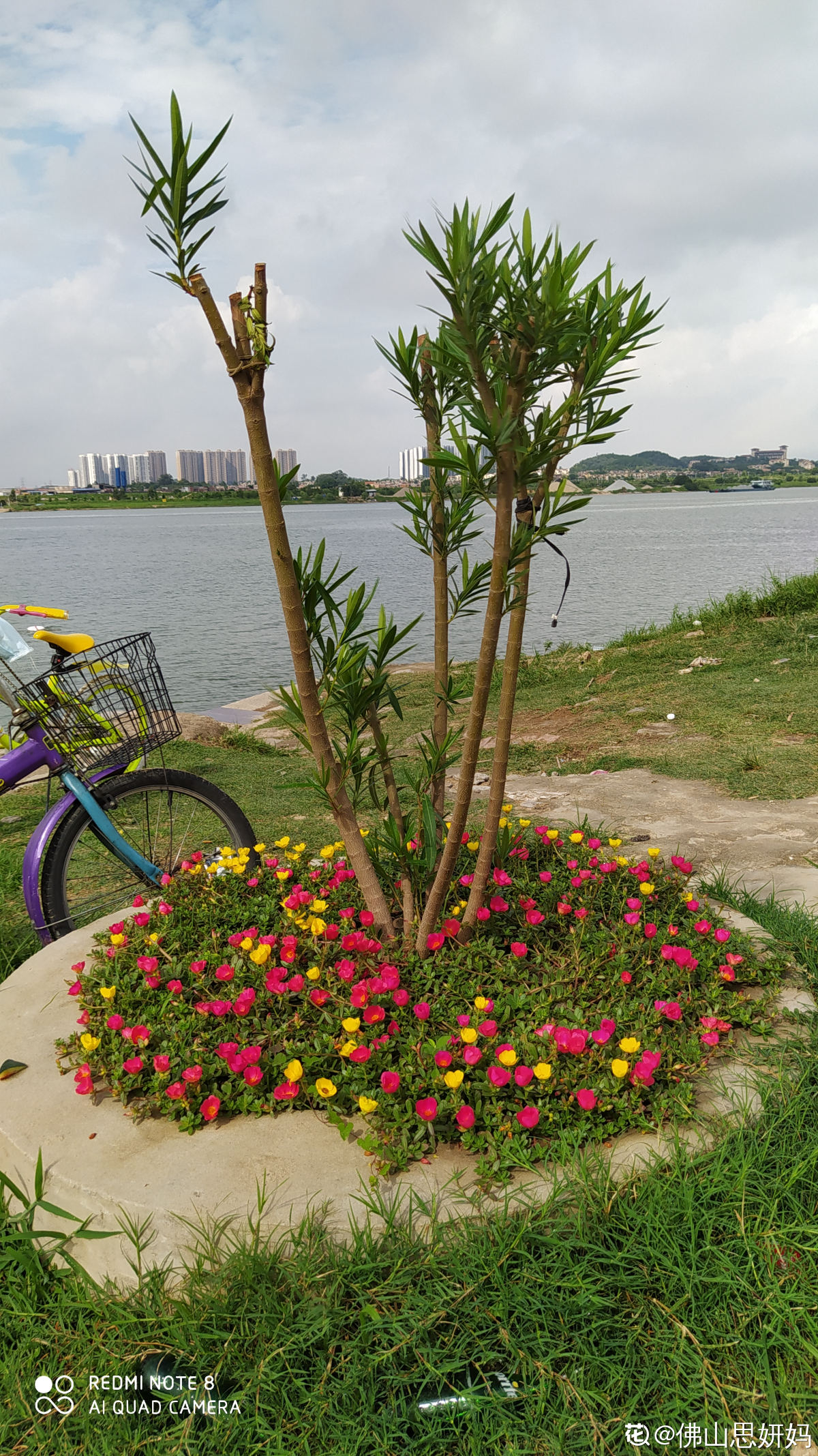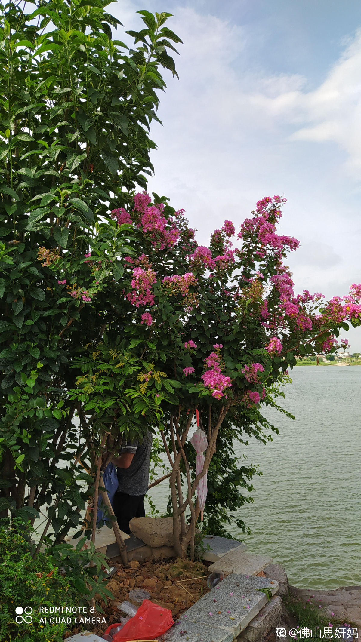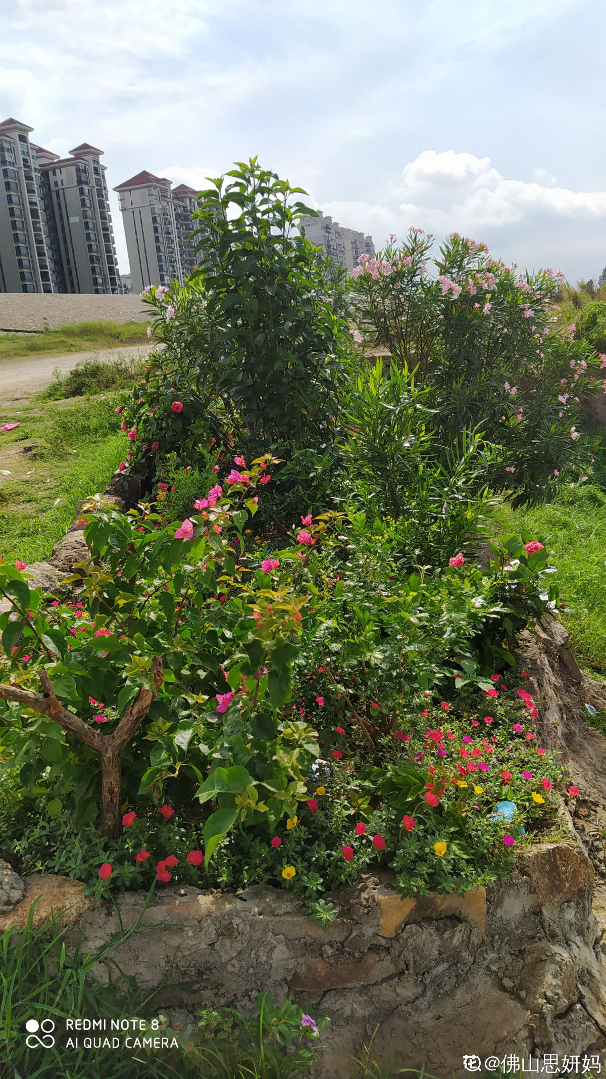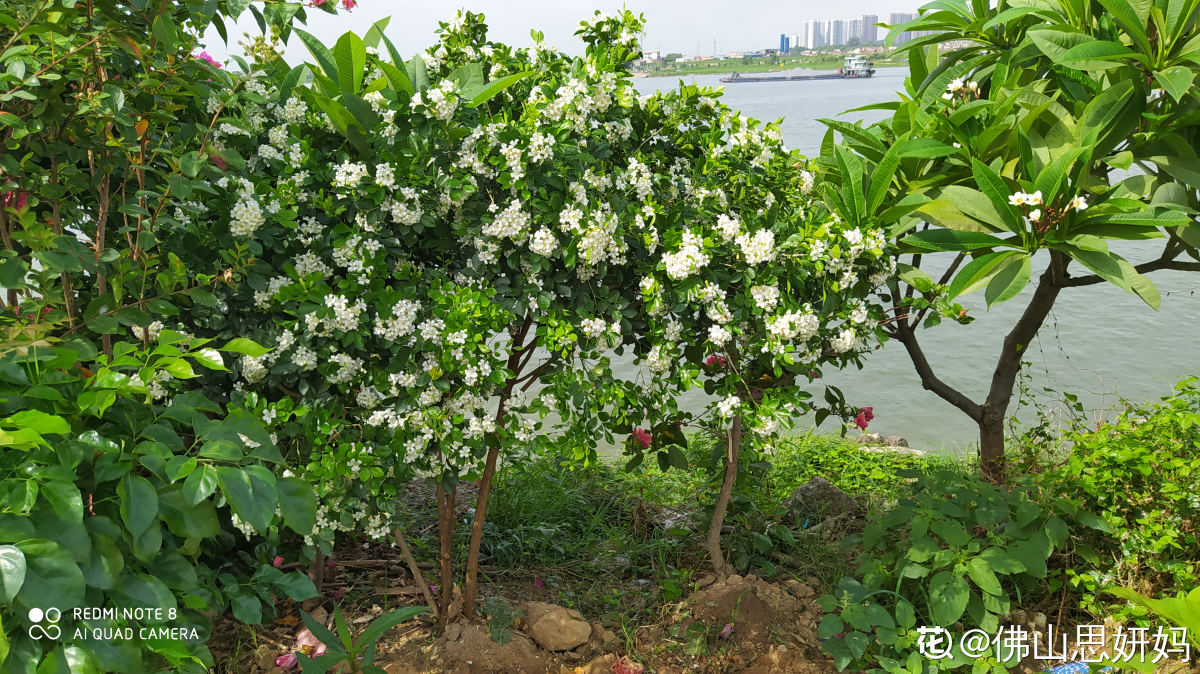 其实在这么多年期间,老人辛苦种的花花被不良分子偷过无数次,有一次种下六棵桂花树,前后被偷挖了四棵。也有过一两次涨水,涨的特别厉害,水都把花给淹没了。去年的时候最惨,水涨得好高,稍微矮的植株全淹了,高的夹竹桃,鸡蛋花也只有树梢露在外面。花友“佛山思妍妈”都为他难过!路过的行人看了也非常舍不得。