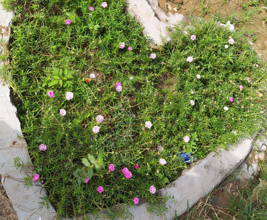后来退潮之后,大株的花基本上没大碍,矮的小的死了很多。不过这都无法阻挡老人喜欢养花的这份热情。大家看,这满地的太阳花都是退潮之后种的,太阳花长得快,很快就变得满地都是了,开花也非常艳丽好看!