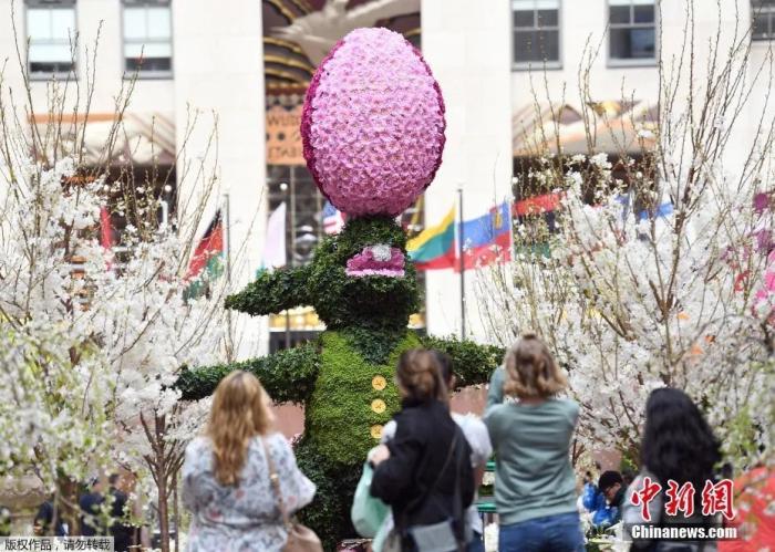 资料图为:当地时间2017年4月13日,美国纽约,洛克菲勒中心香奈儿公园为迎接复活节制作了一只用常春藤与苔藓修剪成的“复活节兔子”,头顶一只雏菊编成的彩蛋逗趣十足,引民众拍照。