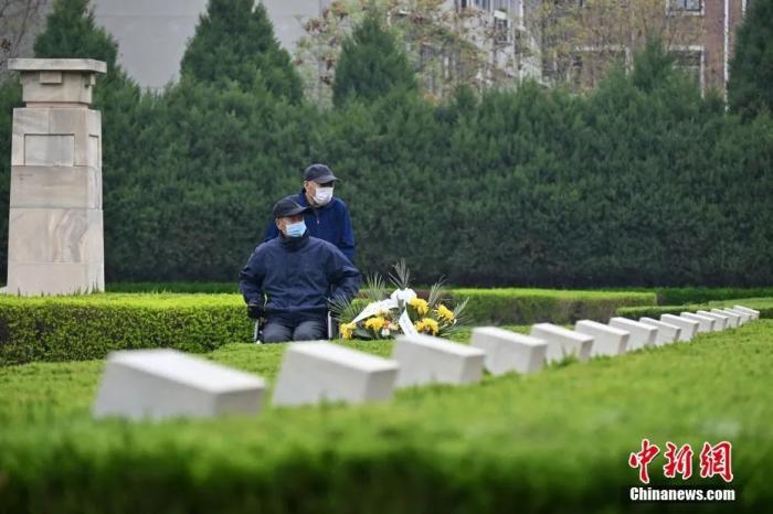 4月1日,在河北石家庄的华北军区烈士陵园烈士墓群处的两位老人。中新社记者 翟羽佳 摄