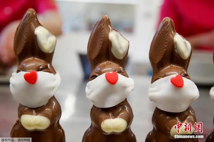 资料图为:戴着防护面具的复活节巧克力兔子。