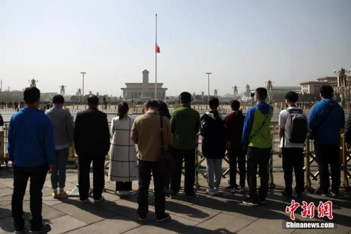2020年4月4日10点整,北京防空警报长鸣三分钟,在天安门参观的的民众肃立默哀。中新社记者 盛佳鹏 摄