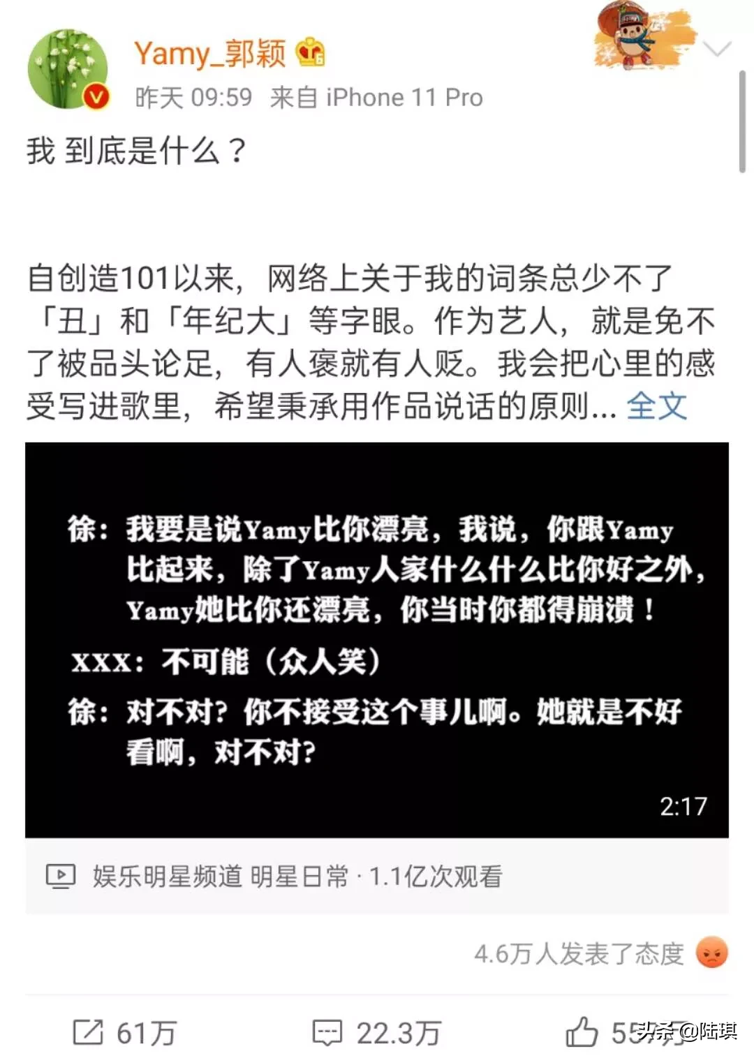 内容是一段会议室的录音,是老板徐明朝当着员工的面大骂Yamy“丑”、“不会唱歌”、“娘炮”。