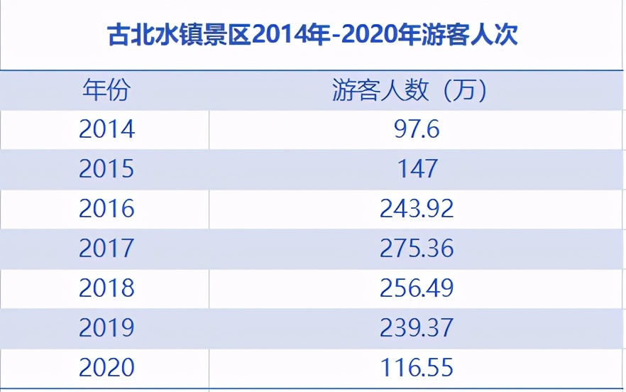 2014年开业之后,古北水镇表现远超预期,连续三年游客量稳步增长,到了2017年,古北水镇的客流总量虽有增长,但是增速就从65.68%跌到了12.89%,2018年,客流人数首次开始下滑,2019年,古北水镇的客流仍然持续下降,2020年的疫情则让客流量直接腰斩了。