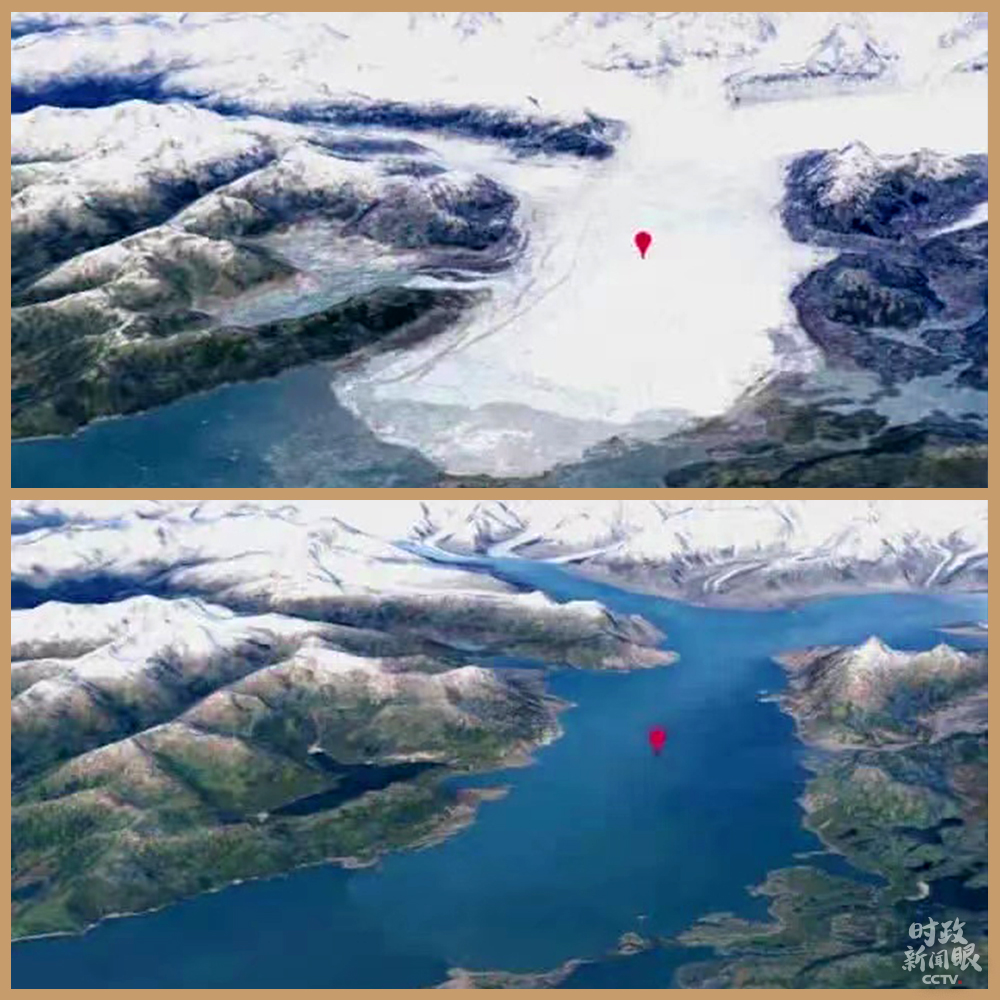 △阿拉斯加,哥伦比亚冰川(上图为1984年,下图为2020年)。哥伦比亚冰川是世界上变化最快的冰川之一,通过照片能清晰看到气候变暖导致冰川不断消退。(资料图)
