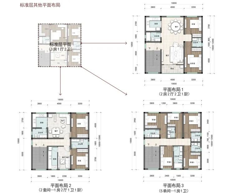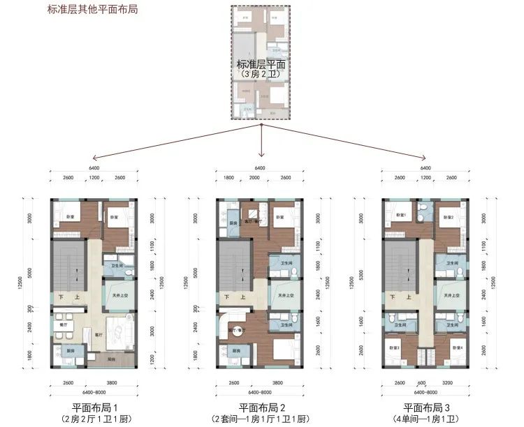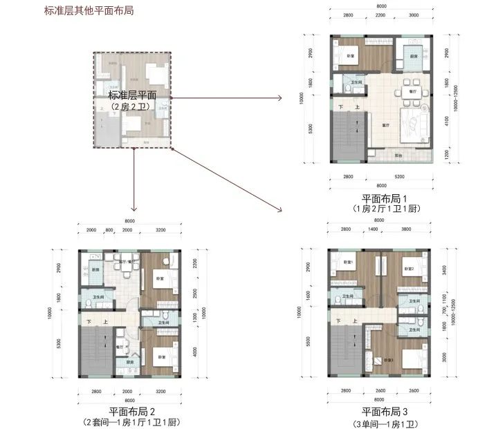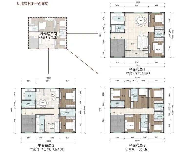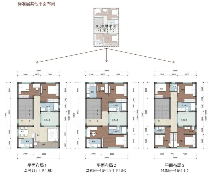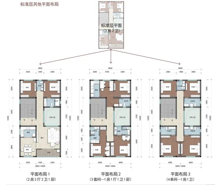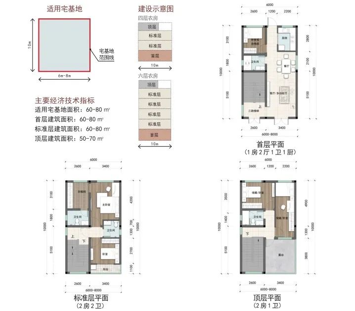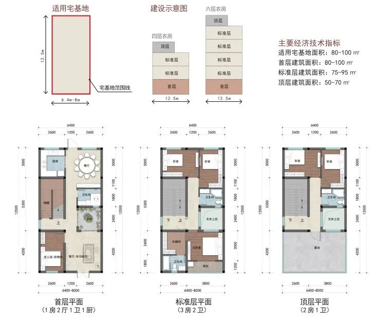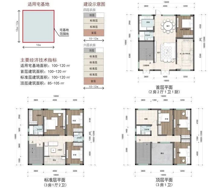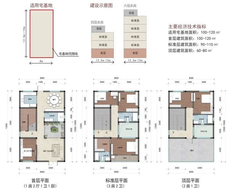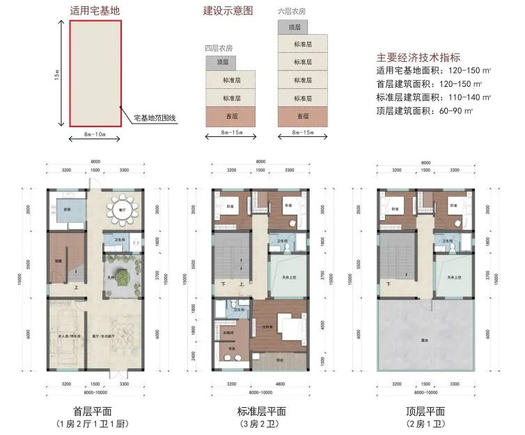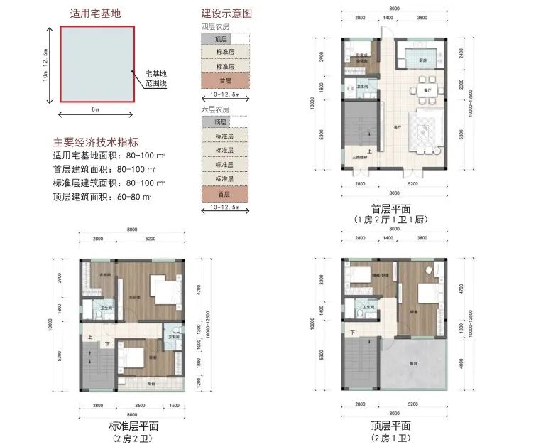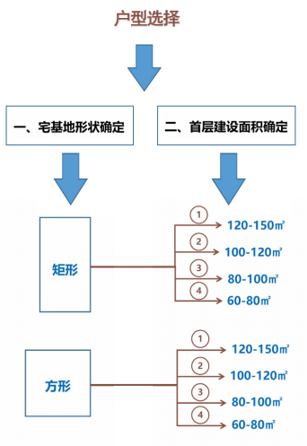 户型篇则分为矩形和方形两种户型,每种户型按照宅基地面积120-150 ㎡、100-120 ㎡、80-100 ㎡、60-80 ㎡进行设计。