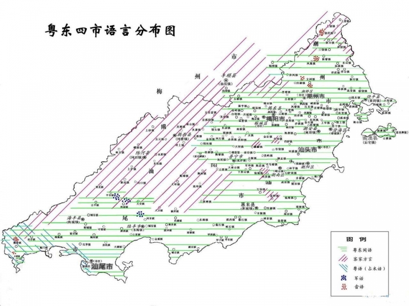潮汕地区主要包括潮州、汕头、揭阳三市,这里除了澄海无客之外,大部分地区分布着客家人,在这里有纯客区和潮客区两部分组成。下面就各市分布情况进行介绍。