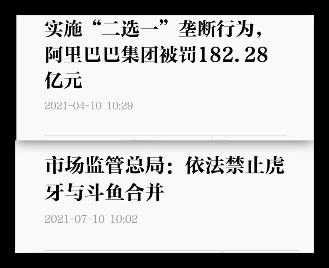 进入2021年以后,先是阿里巴巴被开出182.28亿元的反垄断罚单,接着腾讯主导的虎牙、斗鱼合并被国家市场监管总局依法禁止。